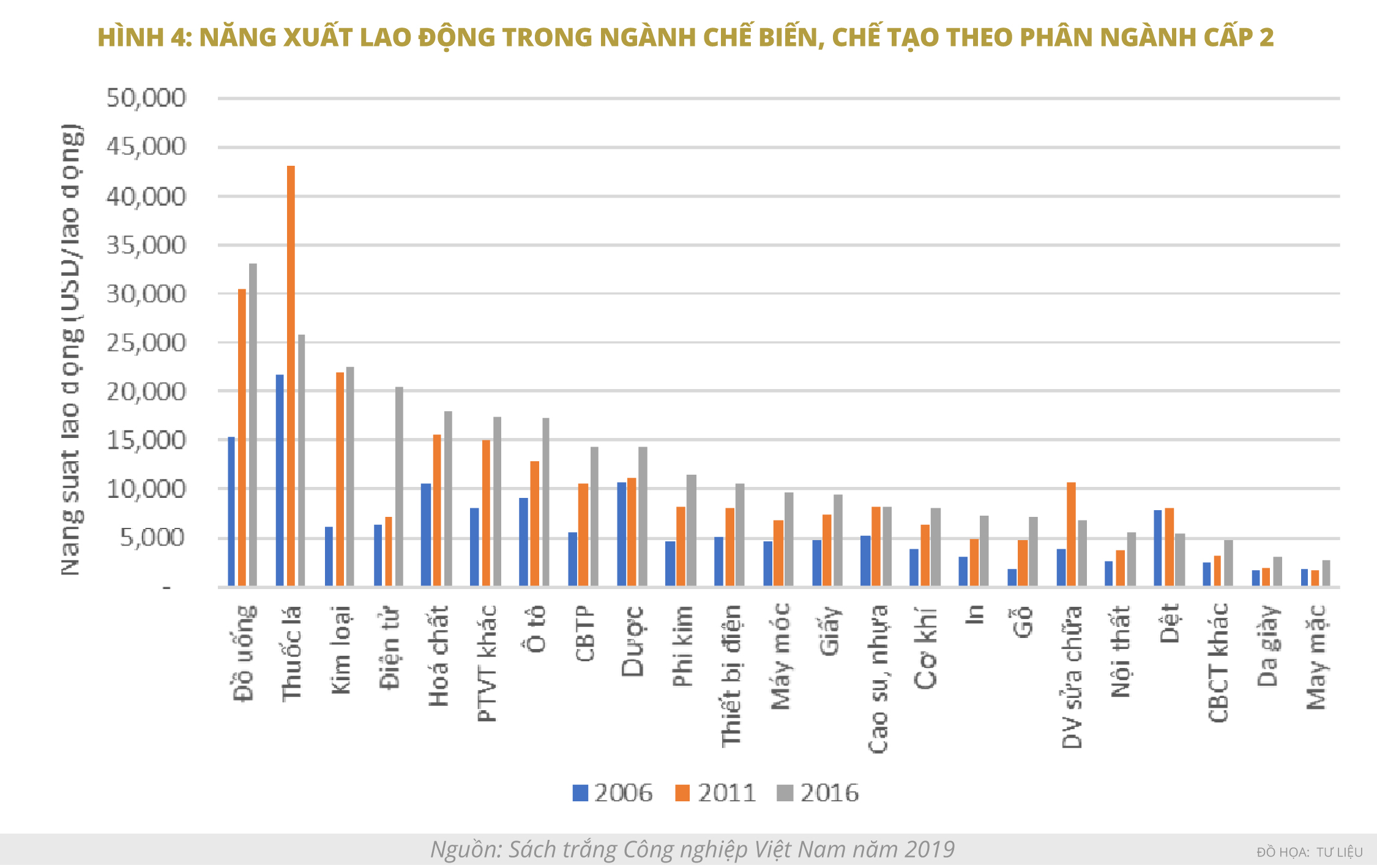 Như vậy, mục tiêu tạo việc làm nếu chỉ dựa vào cơ cấu việc làm trong ngành CBCT thì sẽ không thực sự hiệu quả, bởi vì các ngành thâm dụng lao động, như dệt may và giày dép tạo ra nhiều việc làm nhất nhưng lại có năng suất lao động thấp nhất. Điều này phản ánh đúng thực trạng của ngành dệt may, da giày Việt Nam đang phụ thuộc nhiều vào các doanh nghiệp nước ngoài. Các công đoạn tạo ra giá trị gia tăng cao đều do các doanh nghiệp nước ngoài nắm giữ, doanh nghiệp trong nước chỉ làm gia công cho các sản phẩm thương hiệu nước ngoài, thực hiện công đoạn sản xuất tạo ra giá trị gia tăng thấp nhất trong chuỗi giá trị. Một số ngành công nghiệp mới nổi, như điện tử, hóa chất, máy móc, thiết bị, ô-tô tăng quy mô về lao động nhưng vẫn giữ được tăng trưởng năng suất ổn định, cho thấy ngành CBCT Việt Nam đang có sự thay đổi cơ cấu theo chiều hướng tốt hơn, cần được thúc đẩy mạnh mẽ hơn trong thời gian tới (Xem hình 4).
