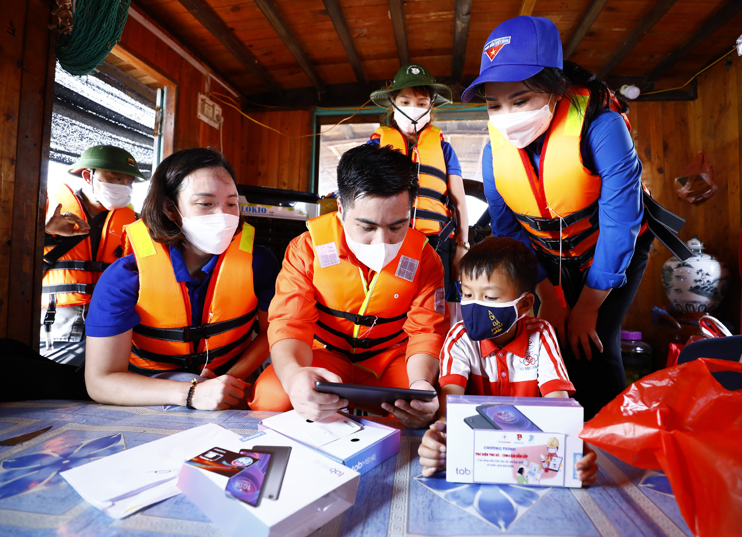 Hướng dẫn sử dụng máy tính bảng - quà tặng cho các cháu thiếu nhi tại làng chài xã Văn Đức, huyện Gia Lâm, thành phố Hà Nội có hoàn cảnh khó khăn _Ảnh: Tư liệu