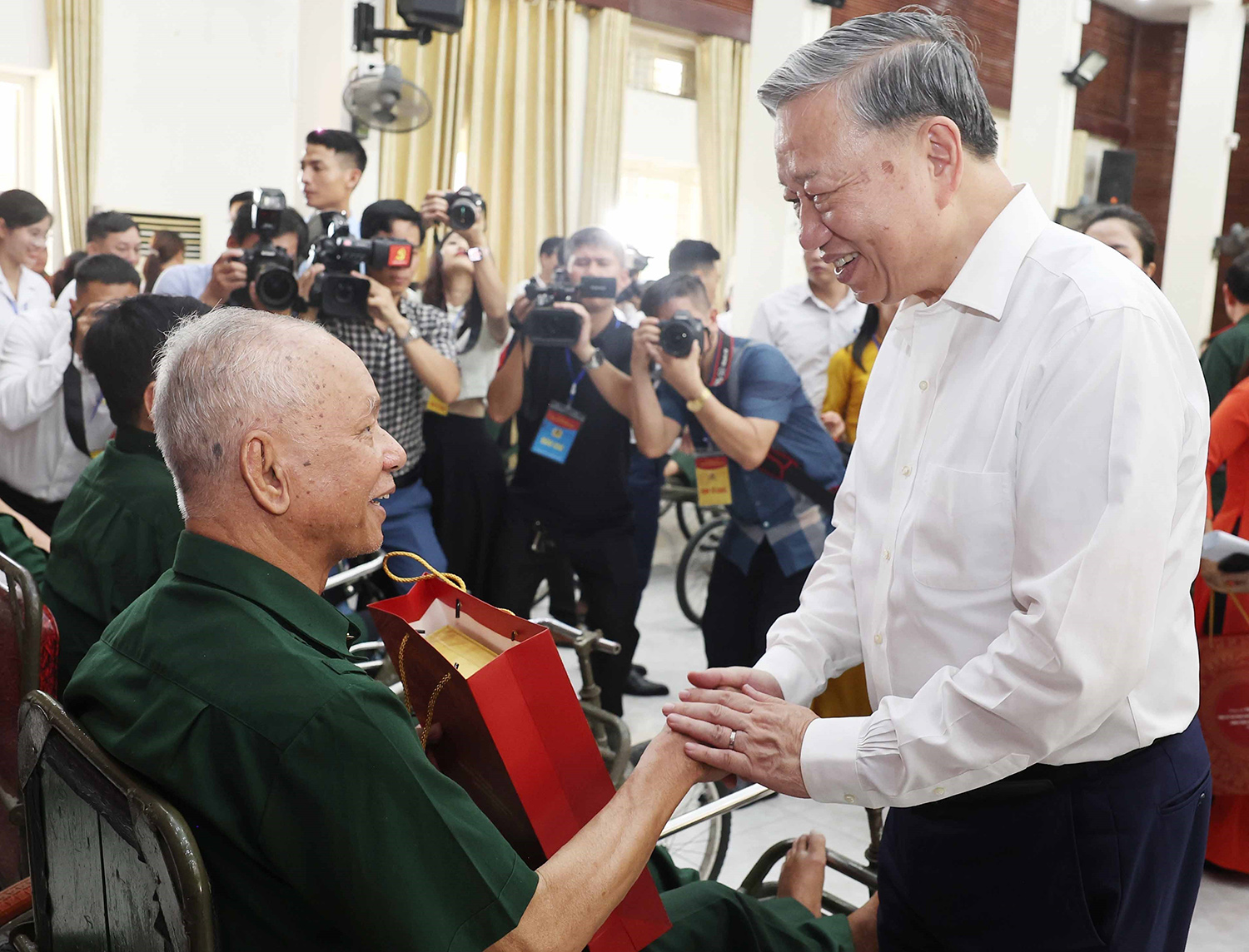Tổng Bí thư Tô Lâm thăm hỏi các thương, bệnh binh _Ảnh: TTXVN