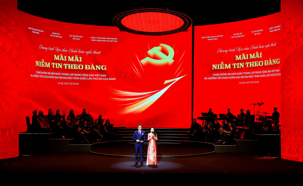 TCCS - Nhân kỷ niệm 96 năm Ngày thành lập Đảng Cộng sản Việt Nam (3-2-1930 - 3-2-2026) và chào mừng Đại hội đại biểu toàn quốc lần thứ XIV của Đảng, ngày 16-1-2026, Ban Tuyên giáo và Dân vận Trung ương, Bộ Biên tập Tạp chí Cộng sản, Đài Truyền hình Việt Nam, Đảng ủy Tập đoàn Công nghiệp - Năng lượng Quốc gia Việt Nam phối hợp tổ chức Chương trình Hòa nhạc chính luận “Mãi mãi niềm tin theo Đảng”.
