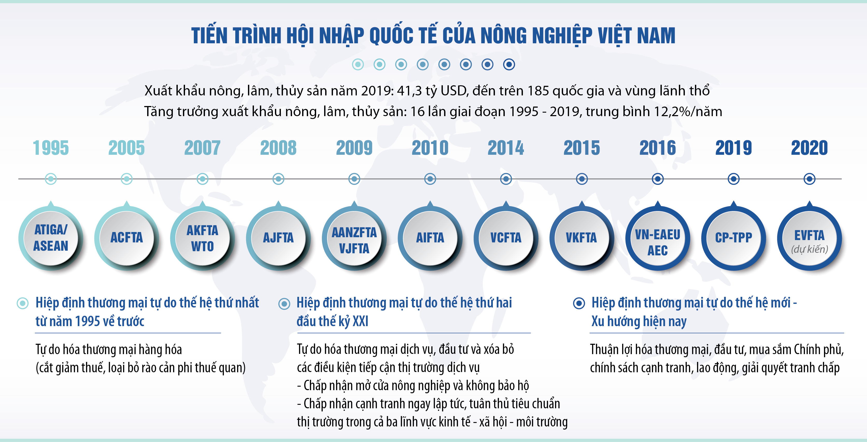 Vietnamese agriculture has strongly participated in the process of globalization and integration into world trade via free trade agreements (FTAs), starting with the first generation FTAs focusing on liberalization of trade in goods (tariff reduction, elimination of non-tariff barriers), to second-generation FTAs which broadened the scope of liberalization to certain service sectors (eliminating conditions to market access in certain services), and new generation FTAs which continue to expand the scope of liberalization of services and investment. As of February 2020, Vietnam has joined 12 FTAs, including 1 signed but not yet effective (EVFTA) yet; and 3 FTAs are under negotiation (RCEP, Vietnam - EFTA FTA, Vietnam - Israel FTA). Vietnam has implemented all commitments in the World Trade Organization (WTO). Since 2010, in addition to traditional trade agreements, Vietnam has actively participated in new generation FTAs, such as the Comprehensive and Progressive Agreement for Trans-Pacific Partnership (CPTPP), EU-Vietnam Free Trade Agreement (EVFTA) with the most extensive and comprehensive level of integration the country has ever implemented. In that global playing field, Vietnam accepts its commitment not to engage in protectionism and comply with most standards of member countries and world markets. The trend of international integration in the coming time requires that Vietnam's agriculture must accept immediate competition, comply with market standards in all three economic, social and environmental aspects.