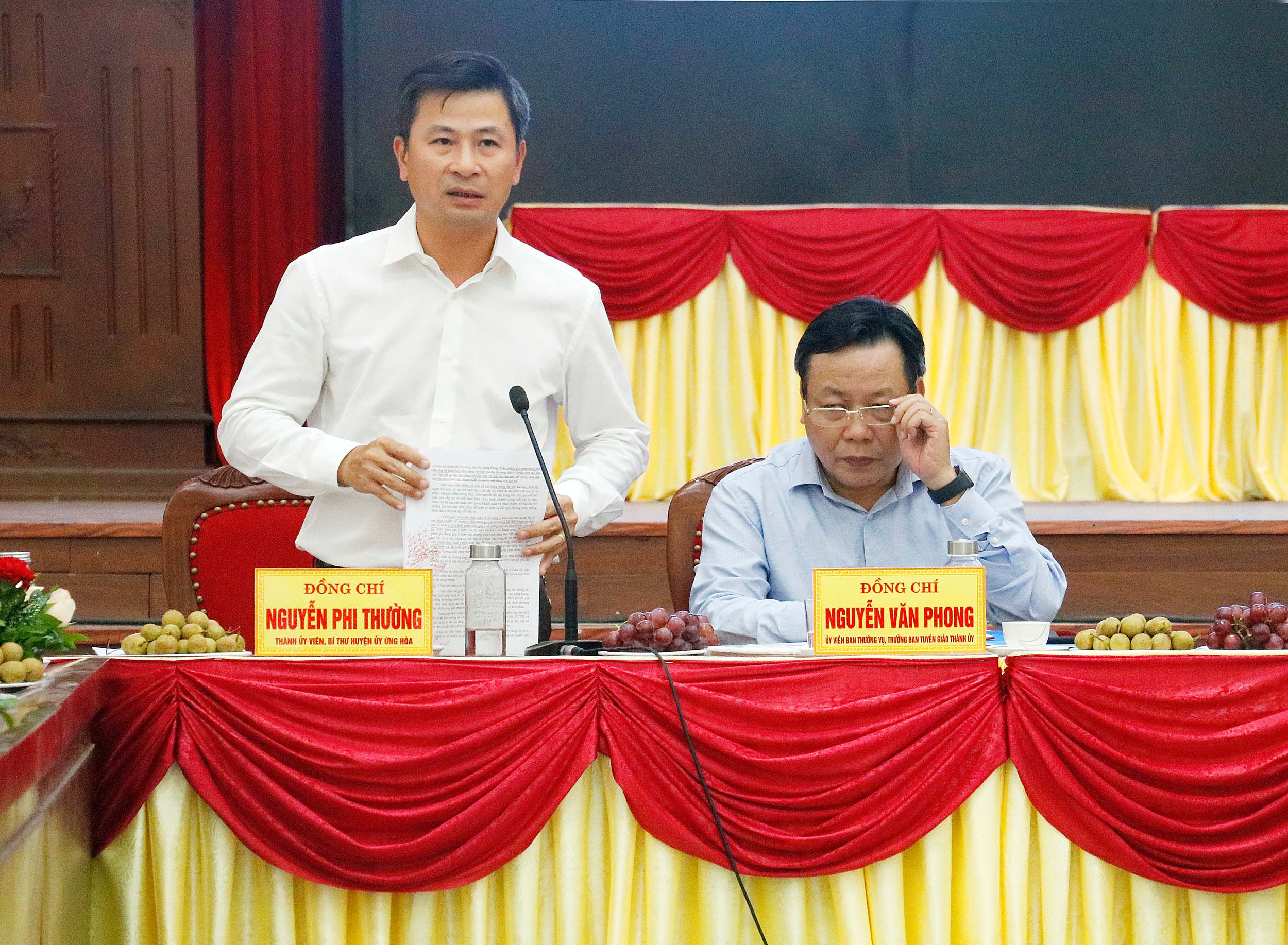 Các đồng chí PGS, TS. Nguyễn Ngọc Hà, Phó Tổng biên tập Tạp chí Cộng sản; TS. Nguyễn Văn Phong, Ủy viên Ban Thường vụ Thành ủy, Trưởng Ban Tuyên giáo Thành ủy Hà Nội; TS. Nguyễn Phi Thường, Thành ủy viên, Bí thư Huyện ủy Ứng Hòa chủ trì tọa đàm. Cùng dự tọa đàm còn có các chuyên gia, các nhà nghiên cứu trong lĩnh vực xây dựng Đảng, các đồng chí lãnh đạo đại diện các quận ủy, huyện ủy thuộc Thành ủy Hà Nội, bí thư đảng ủy các xã, thị trấn của Huyện ủy Ứng Hòa…