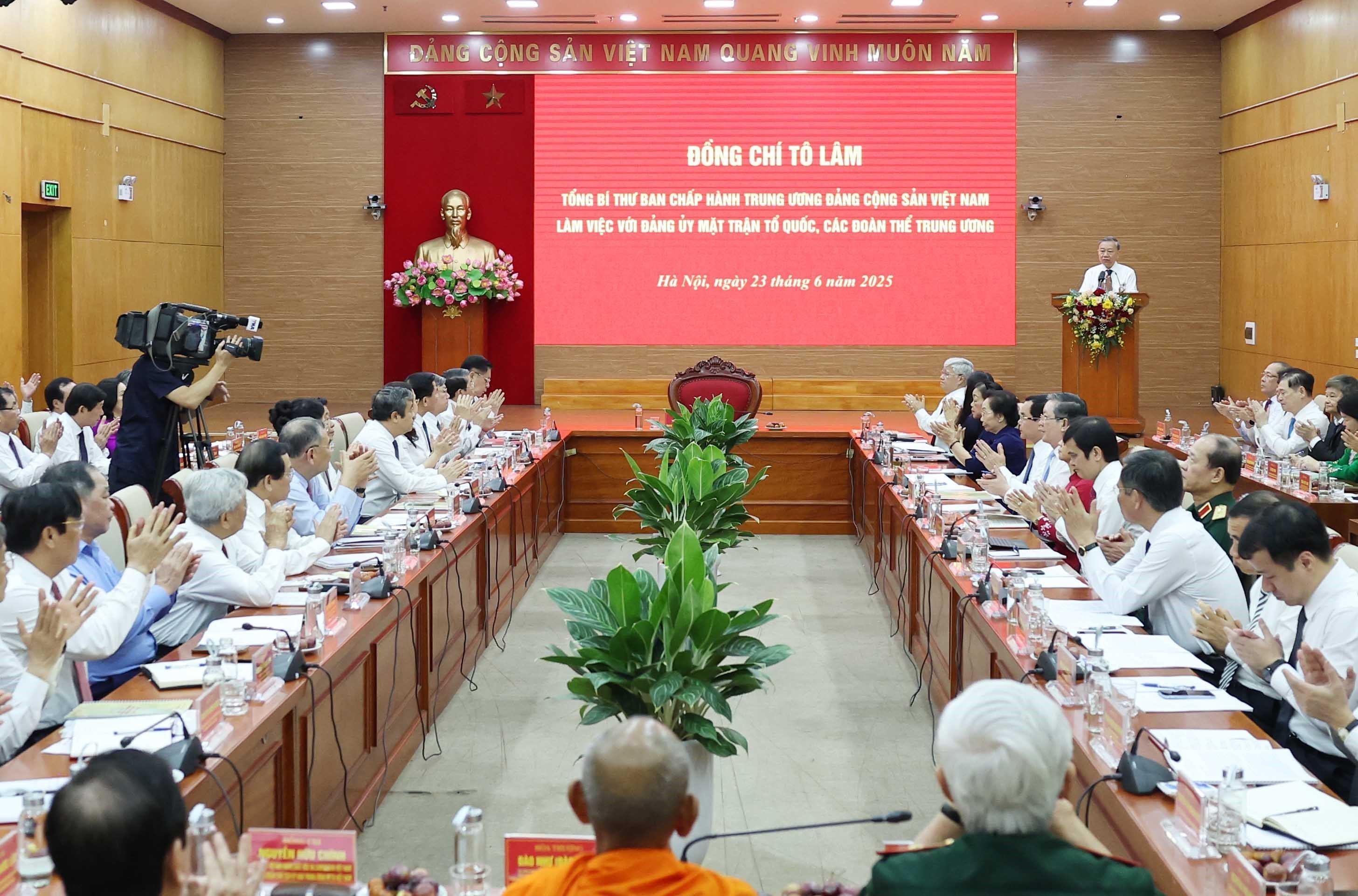 TCCS - Ngày 23-6-2025, tại Hà Nội, Tổng Bí thư Tô Lâm và Đoàn công tác Trung ương làm việc với Đảng ủy Mặt trận Tổ quốc (MTTQ), các đoàn thể Trung ương về kết quả lãnh đạo thực hiện nhiệm vụ chính trị và công tác xây dựng Đảng thời gian qua, nhiệm vụ trọng tâm thời gian tới.