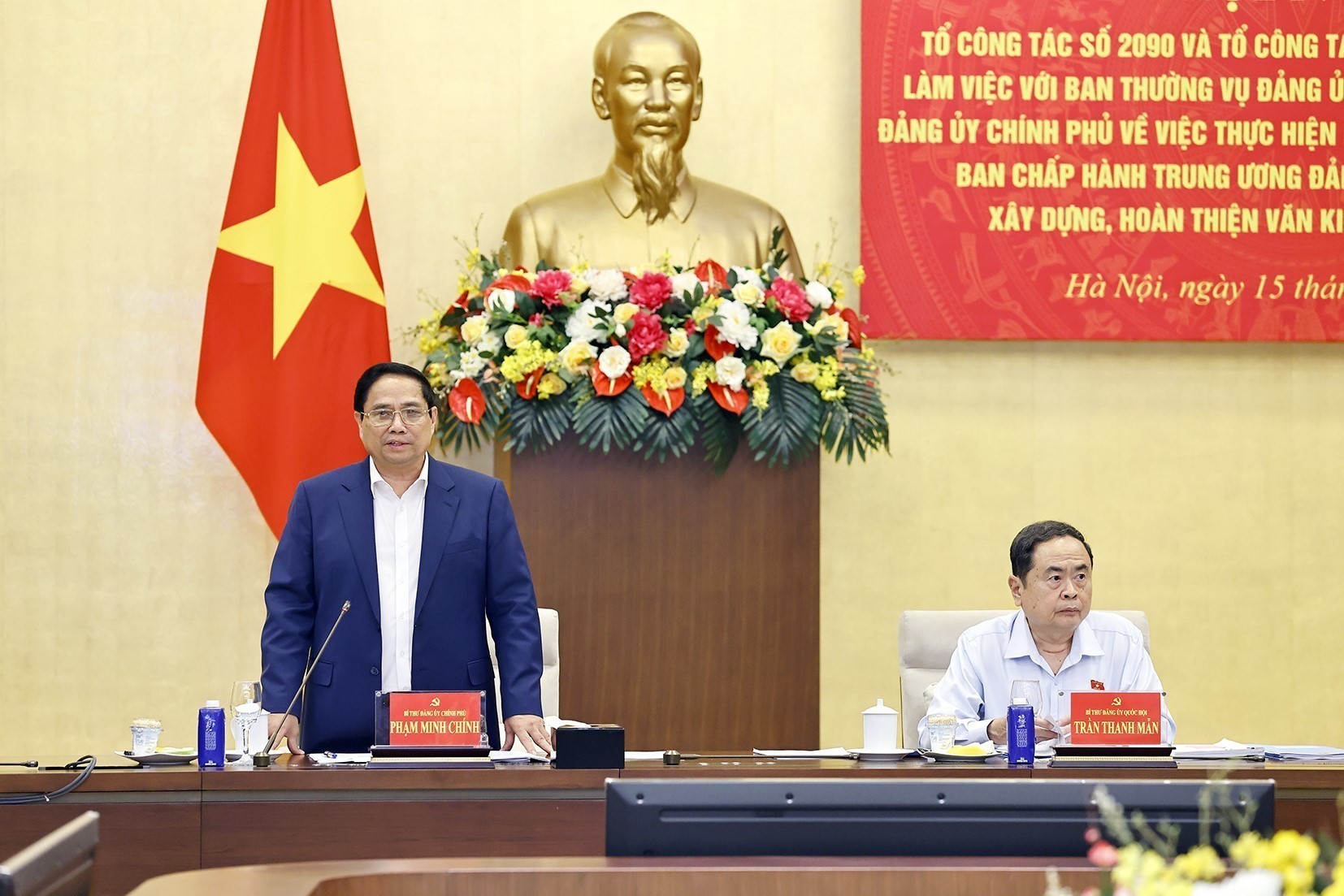 TCCS - Ngày 15-7-2025, tại nhà Quốc hội, Tổ công tác số 2090 và Tổ công tác số 2091 của Bộ Chính trị làm việc với Ban Thường vụ Đảng ủy Quốc hội và Ban Thường vụ Đảng ủy Chính phủ về việc thực hiện Nghị quyết Hội nghị Trung ương 11 khóa XIII (Nghị quyết số 60-NQ/TW) gắn với việc xây dựng, hoàn thiện văn kiện, công tác nhân sự. Ủy viên Bộ Chính trị, Bí thư Đảng ủy Chính phủ, Thủ tướng Chính phủ Phạm Minh Chính và Ủy viên Bộ Chính trị, Bí thư Đảng ủy Quốc hội, Chủ tịch Quốc hội Trần Thanh Mẫn chủ trì cuộc làm việc.