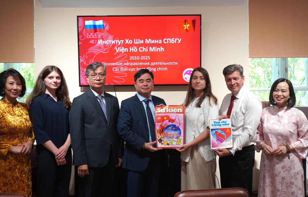 Ngày 14-8-2025, Đoàn công tác của Tạp chí Cộng sản làm việc tại Viện Hồ Chí Minh thuộc Đại học Quốc gia Saint Petersburg. GS. Vladimir Kolotov, Giám đốc Viện Hồ Chí Minh đón tiếp Đoàn.