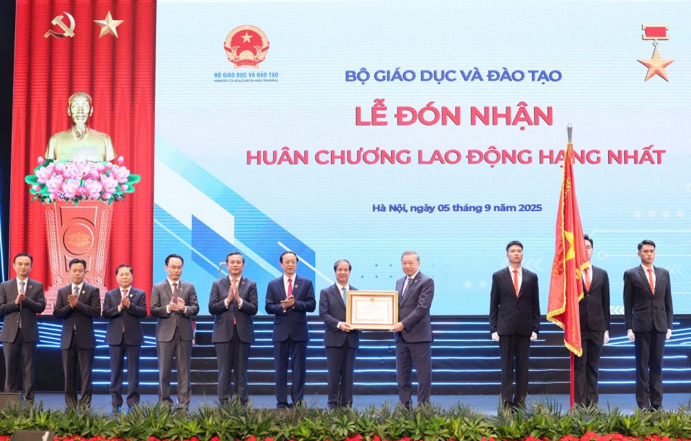 Nhân dịp này, thay mặt lãnh đạo Đảng, Nhà nước, Tổng Bí thư Tô Lâm đã trao Huân chương Lao động hạng Nhất tặng Bộ Giáo dục và Đào tạo vì đã có thành tích xuất sắc trong công tác quản lý nhà nước về đào tạo, bồi dưỡng học sinh, sinh viên tài năng đạt giải cao trong các kỳ thi Olympic khu vực và quốc tế, góp phần nâng cao hiệu quả đào tạo nguồn nhân lực chất lượng cao phục vụ phát triển kinh tế - xã hội của đất nước giai đoạn 2023 - 2025./.