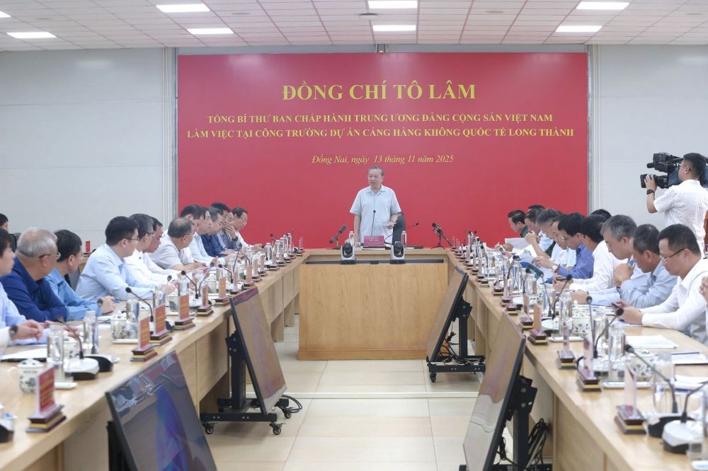 TCCS - Ngày 13-11-2025, tại tỉnh Đồng Nai, Tổng Bí thư Tô Lâm và Đoàn công tác trung ương thăm, làm việc về tình hình thực hiện dự án trọng điểm quốc gia xây dựng Cảng hàng không quốc tế Long Thành và định hướng phát triển trong môi trường cạnh tranh khu vực và quốc tế.
