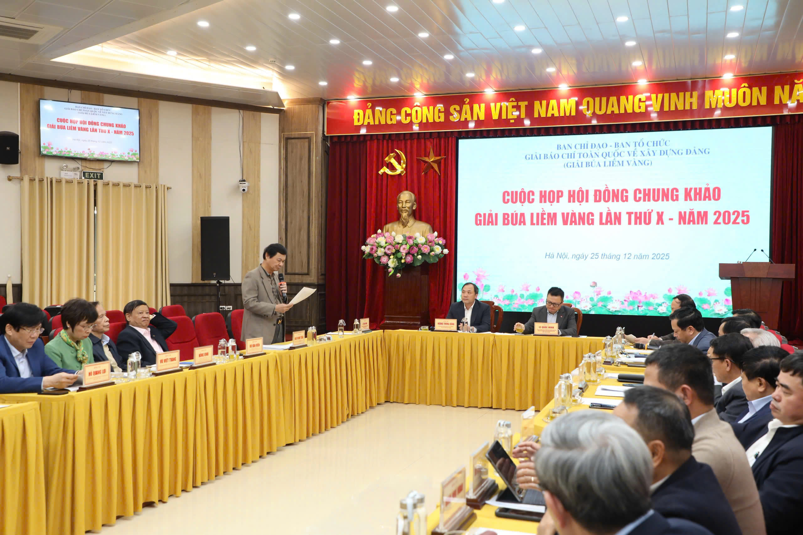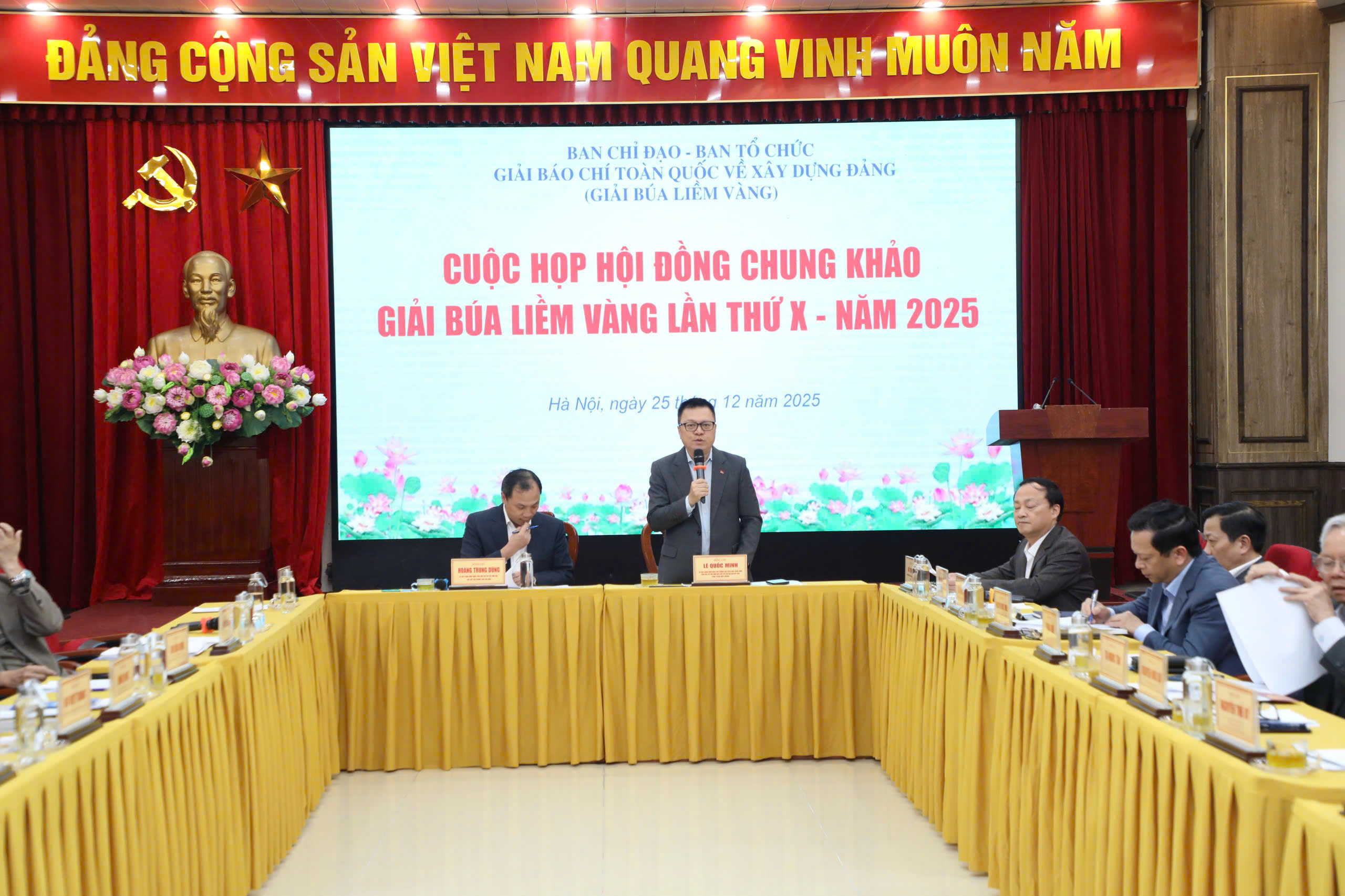 TCCS - Ngày 25-12-2025, Hội đồng chung khảo Giải báo chí toàn quốc về xây dựng Đảng (Giải Búa liềm vàng) lần thứ X - năm 2025 họp xét các tác phẩm xuất sắc để trao giải. Chủ trì cuộc họp có các đồng chí Ủy viên Trung ương Đảng: Lê Quốc Minh, Phó Trưởng Ban Tuyên giáo và Dân vận Trung ương, Tổng Biên tập Báo Nhân dân, Chủ tịch Hội Nhà báo Việt Nam, Chủ tịch Hội đồng chung khảo; TS Hoàng Trung Dũng, Tổng Biên tập Tạp chí Cộng sản.