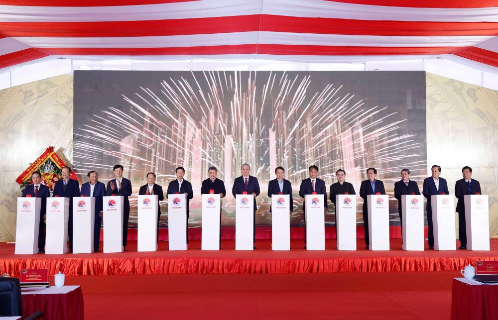 Tổng Bí thư Tô Lâm cùng các đại biểu thực hiện nghi thức khởi công xây dựng công trình Trường Phổ thông nội trú tiểu học và trung học cơ sở Trường Hà_Ảnh: TTXVN