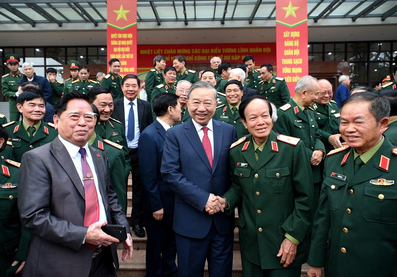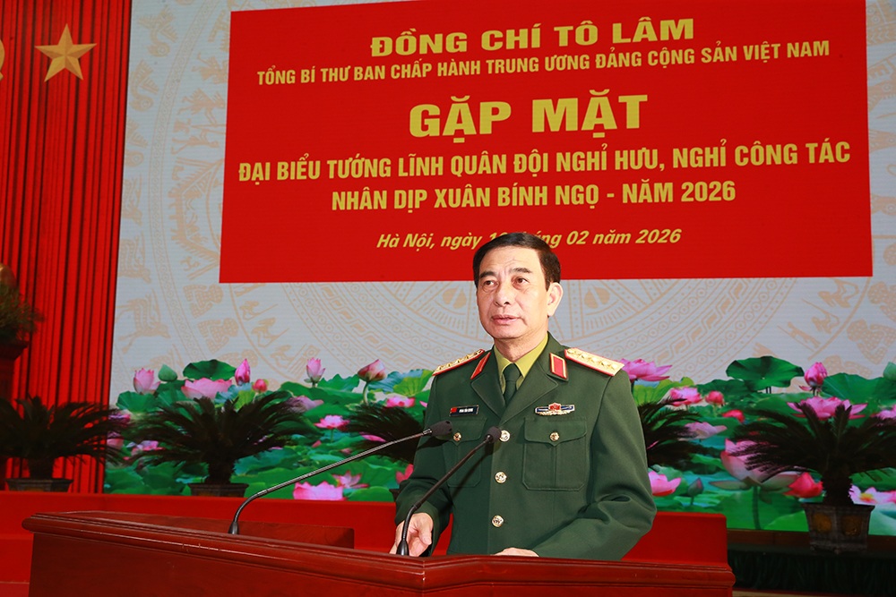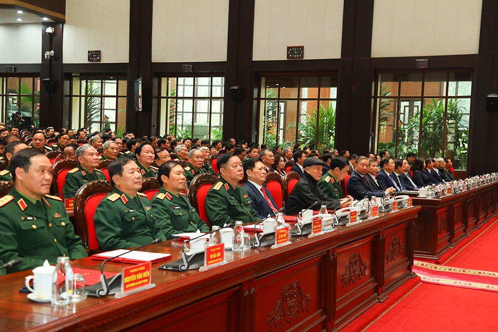 Phát biểu tại buổi gặp mặt, thay mặt lãnh đạo Đảng, Nhà nước, Quân ủy Trung ương, Tổng Bí thư Tô Lâm bày tỏ xúc động và vui mừng được gặp mặt các đồng chí đại biểu tướng lĩnh quân đội nghỉ hưu, nghỉ công tác; khẳng định cuộc gặp mặt rất ý nghĩa khi chúng ta vừa tổ chức thành công rất tốt đẹp Đại hội đại biểu toàn quốc lần XIV của Đảng - Đại hội của ý chí tự chủ, tự lực, tự cường, tự tin trong kỷ nguyên vươn mình của dân tộc. Nhìn lại chặng đường 96 năm dưới sự lãnh đạo của Đảng, 40 năm đổi mới, đất nước ta chưa bao giờ có được cơ đồ, tiềm lực, vị thế uy tín quốc tế như ngày nay. Những thành quả vĩ đại đó được kết tinh từ máu xương, trí tuệ và bản lĩnh của các thế hệ người Việt Nam yêu nước, trong đó có sự đóng góp to lớn đặc biệt quan trọng của Quân đội nhân dân Việt Nam anh hùng và cá nhân các đồng chí tướng lĩnh, sĩ quan cao cấp. Các đồng chí là những người chỉ huy xuất sắc trên mặt trận quân sự, chính trị; là những tấm gương sáng ngời về đạo đức cách mạng, lòng trung thành tuyệt đối với Đảng, với Tổ quốc và nhân dân.