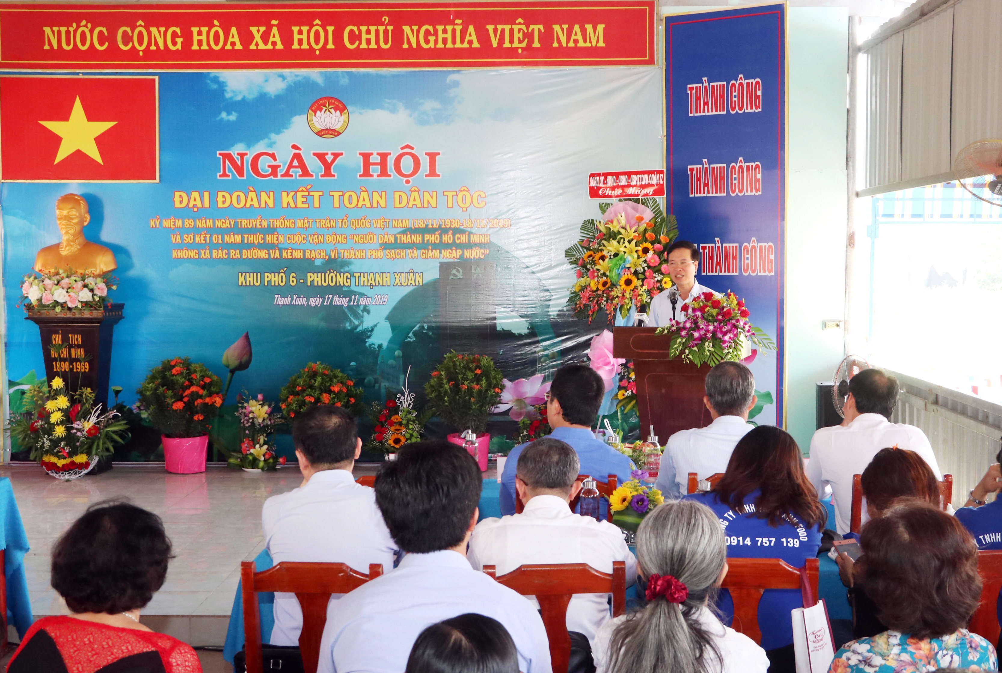 Thay mặt lãnh đạo Đảng, Nhà nước, đồng chí Võ Văn Thưởng chúc mừng những thành tựu tích cực mà Quận 12 nói chung, nhân dân khu phố 6, phường Thạnh Xuân nói riêng đã đạt được trong xây dựng và phát triển kinh tế, văn hóa, xã hội của địa phương, đặc biệt trong việc thực hiện các phong trào thi đua “Người dân Thành phố Hồ Chí Minh không xả rác ra đường, kênh rạch vì thành phố sạch và giảm ngập nước”; cuộc vận động “Quận 12 văn minh sạch đẹp”… Một trong những kết quả đáng trân trọng là trên địa bàn khu phố có nhiều bà con từ các địa phương khác về sinh sống nhưng người dân đã cùng đoàn kết, phát huy tinh thần cộng đồng xây dựng khu phố sạch, đẹp, văn minh, đời sống người dân ngày càng được nâng lên.