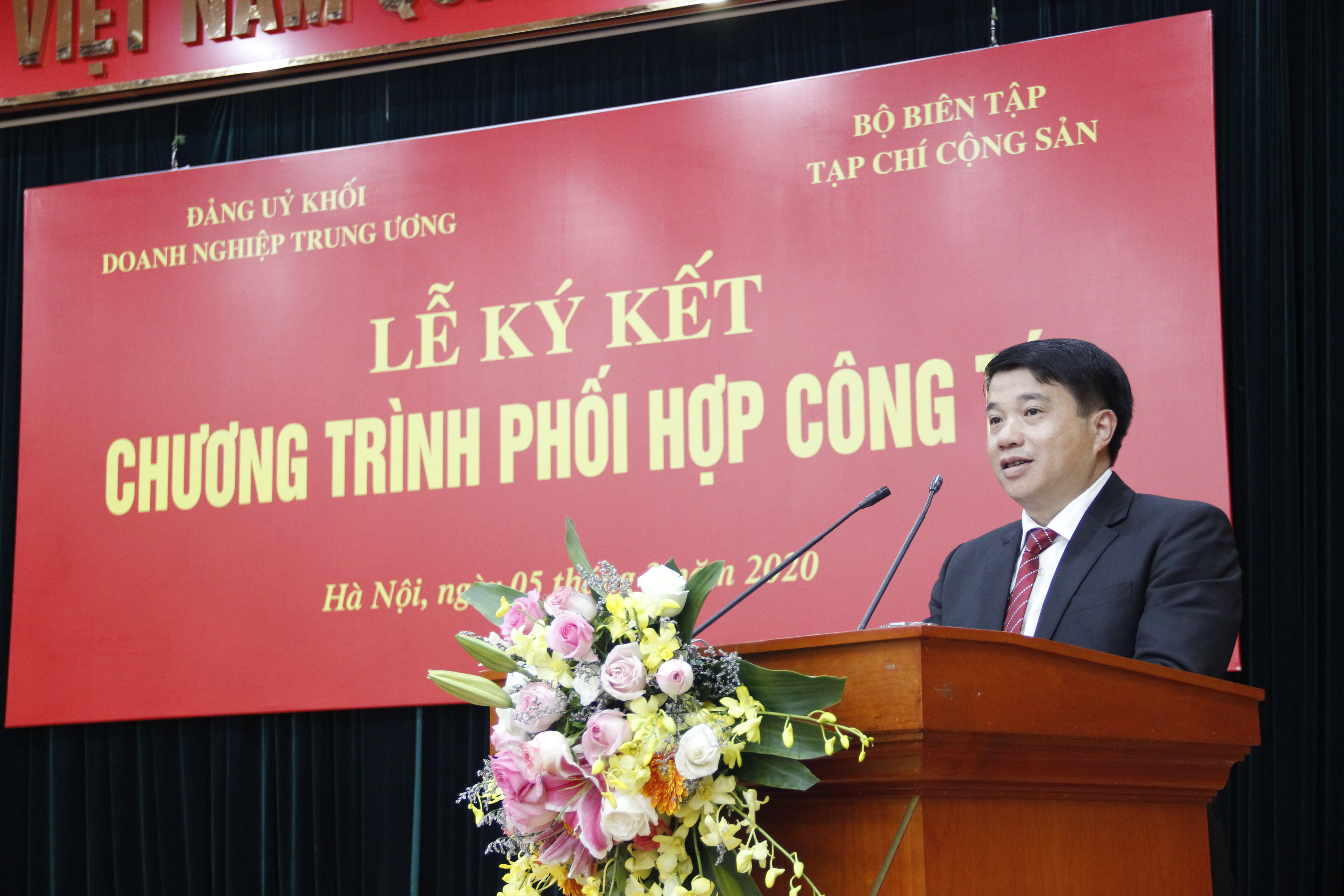 Phát biểu tại buổi lễ, đồng chí Đoàn Minh Huấn, Tổng Biên tập, Bí thư Đảng ủy Tap chí Cộng sản, cho biết, sự phối hợp giữa hai cơ quan đã được diễn ra thường xuyên, có hiệu quả trong thời gian qua và đến nay đủ chín muồi về các điều kiện để chính thức ký kết chương trình phối hợp. Hoạt động của Đảng ủy Khối Doanh nghiệp Trung ương chính là nguồn dữ liệu quan trọng, phong phú và sinh động giúp Tạp chí Cộng sản có thể tổng kết những vấn đề có chiều sâu, mang tầm lý luận về công tác xây dựng Đảng trong doanh nghiệp nhà nước nói riêng, các vấn đề lý luận về kinh tế thị trường định hướng xã hội chủ nghĩa nói chung, nhất là về các mô hình mới, cách làm hay… để có thể nhân rộng trong toàn Đảng. Điều này càng có ý nghĩa khi chúng ta đang bên thềm đại hội đảng bộ các cấp, tiến tới Đại hội XIII của Đảng.