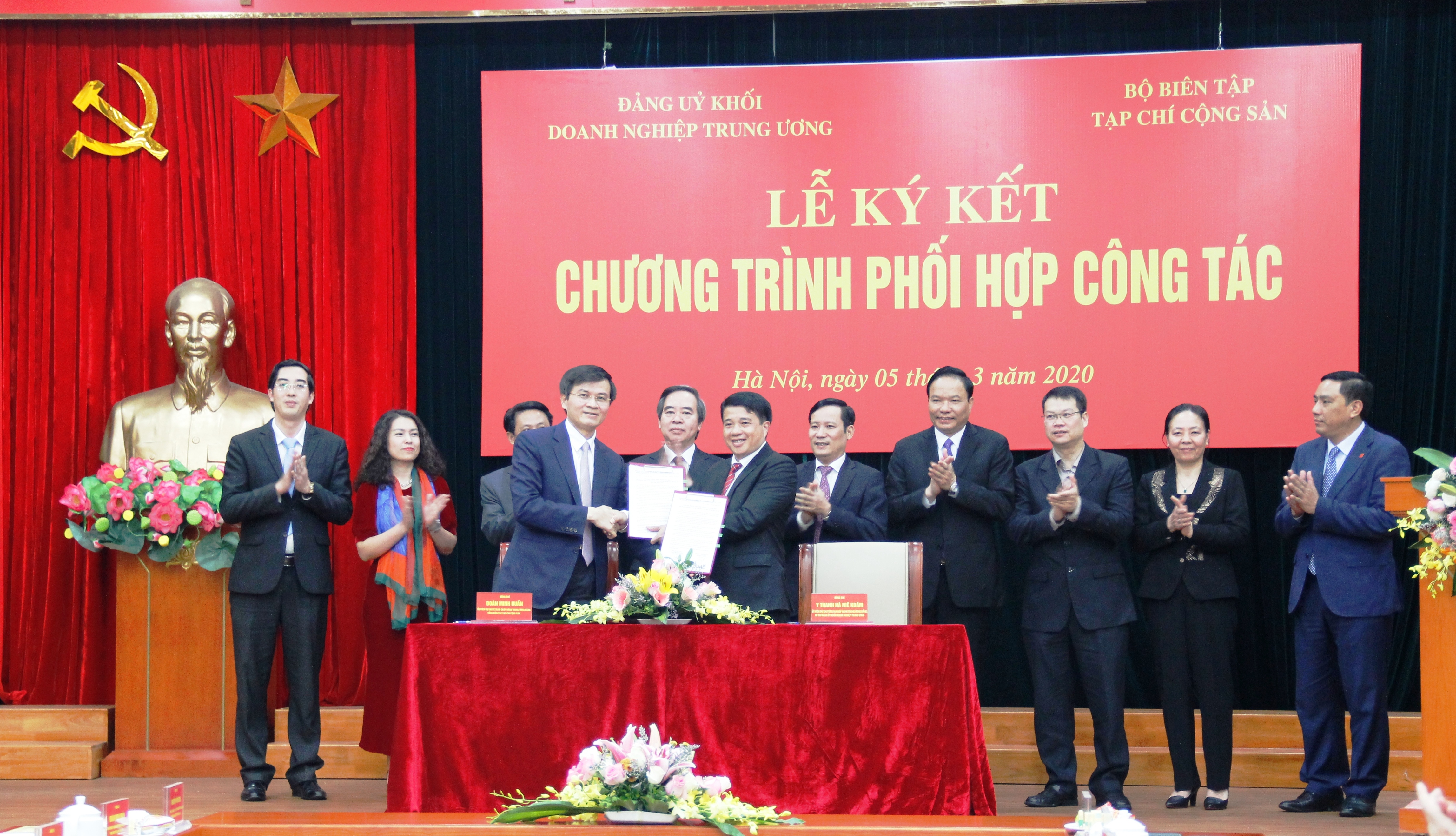 TCCS - Ngày 5-3-2020, tại Hà Nội, Bộ Biên tập Tạp chí Cộng sản và Đảng ủy Khối Doanh nghiệp Trung ương tổ chức Lễ ký Chương trình phối hợp công tác giai đoạn 2020 - 2025, trong đó trọng tâm là phối hợp nghiên cứu lý luận và tổng kết thực tiễn về kinh tế nhà nước, doanh nghiệp nhà nước, công tác xây dựng Đảng trong doanh nghiệp nhà nước, góp phần bổ sung, phát triển đường lối, chủ trương của Đảng, chính sách, pháp luật của Nhà nước, đề xuất tháo gỡ các điểm nghẽn để tạo đột phá cho doanh nghiệp nhà nước phát triển bền vững.