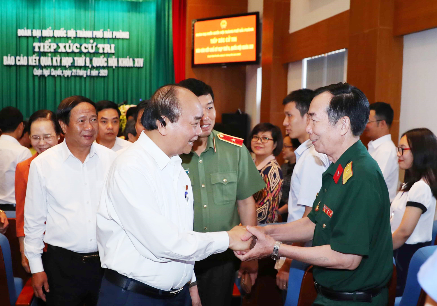 TCCS - Ngày 21-6-2020, Ủy viên Bộ Chính trị, Thủ tướng Chính phủ Nguyễn Xuân Phúc cùng Đoàn đại biểu Quốc hội thành phố Hải Phòng tiếp xúc cử tri tại quận Ngô Quyền, báo cáo về kết quả của kỳ họp thứ 9, Quốc hội khóa XIV.