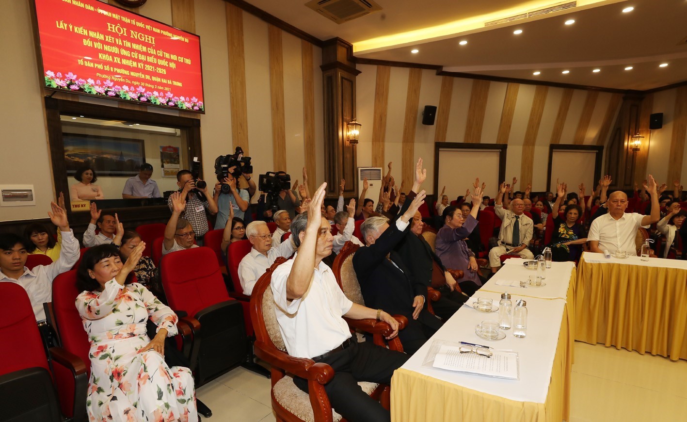 Cử tri Tổ dân phố số 8 phường Nguyễn Du biểu quyết nhất trí 100% ủng hộ Tổng Bí thư, Chủ tịch nước Nguyễn Phú Trọng tham gia ứng cử đại biểu Quốc hội khoá XV, nhiệm kỳ 2021 - 2026_Ảnh: TTXVN