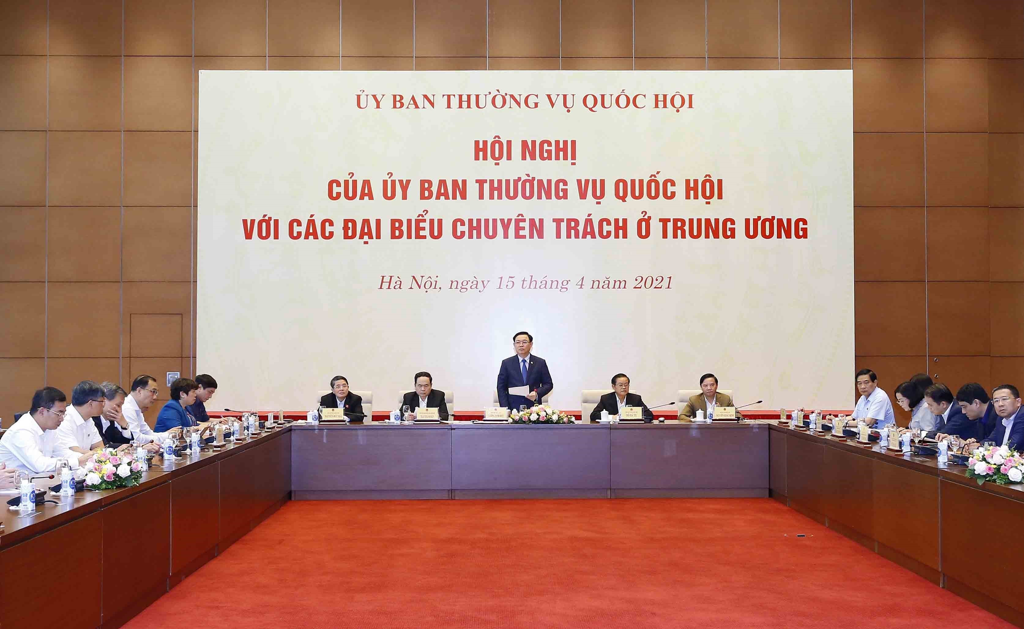 TCCS - Ngày 15-4-2021, tại nhà Quốc hội,  Ủy ban Thường vụ Quốc hội tổ chức Hội nghị của Ủy ban Thường vụ Quốc hội với các đại biểu chuyên trách ở trung ương nhằm đề xuất, kiến nghị giải pháp tiếp tục đổi mới, nâng cao chất lượng, hiệu quả hoạt động của Quốc hội. Ủy viên Bộ Chính trị, Chủ tịch Quốc hội Vương Đình Huệ chủ trì hội nghị.