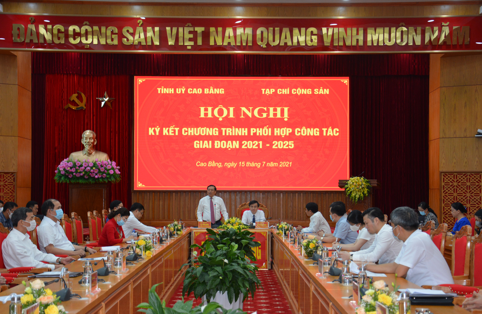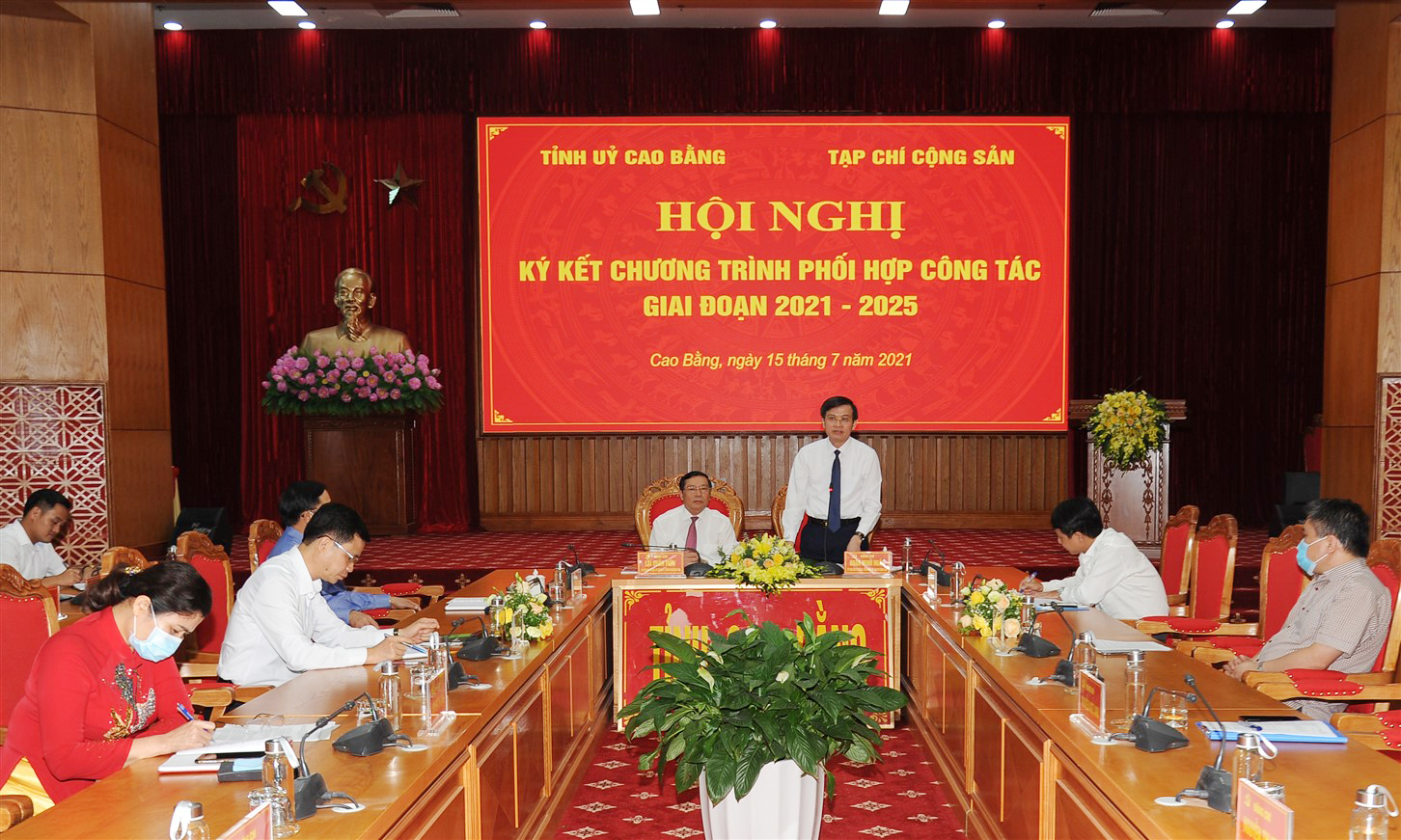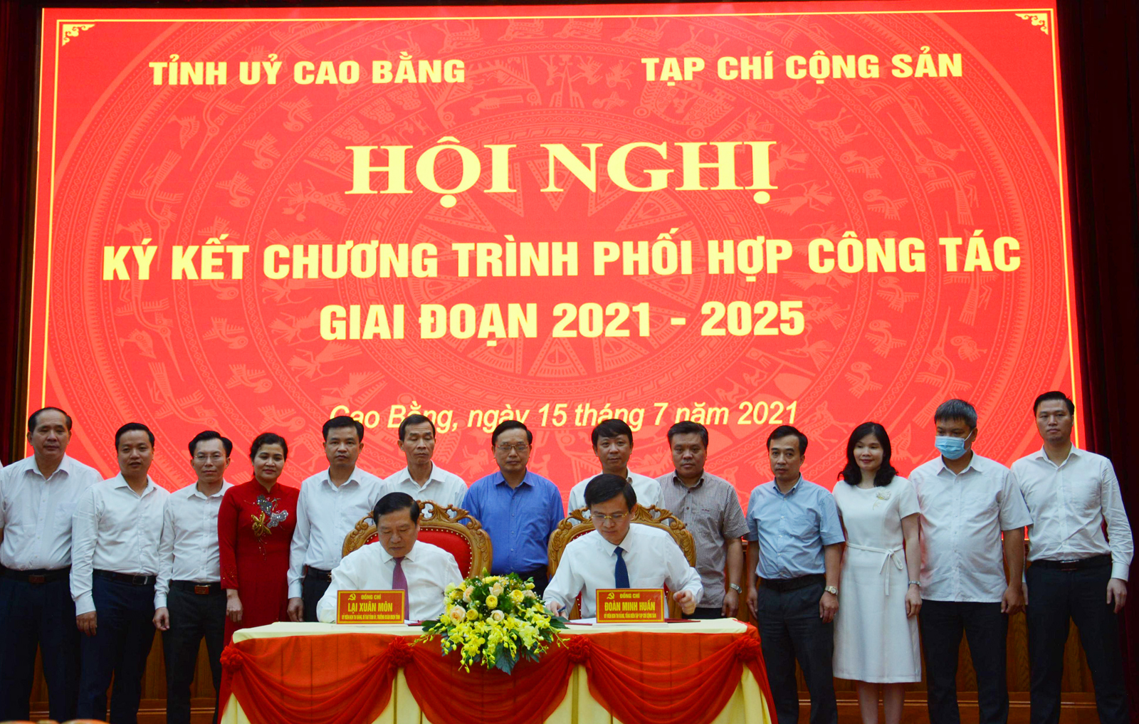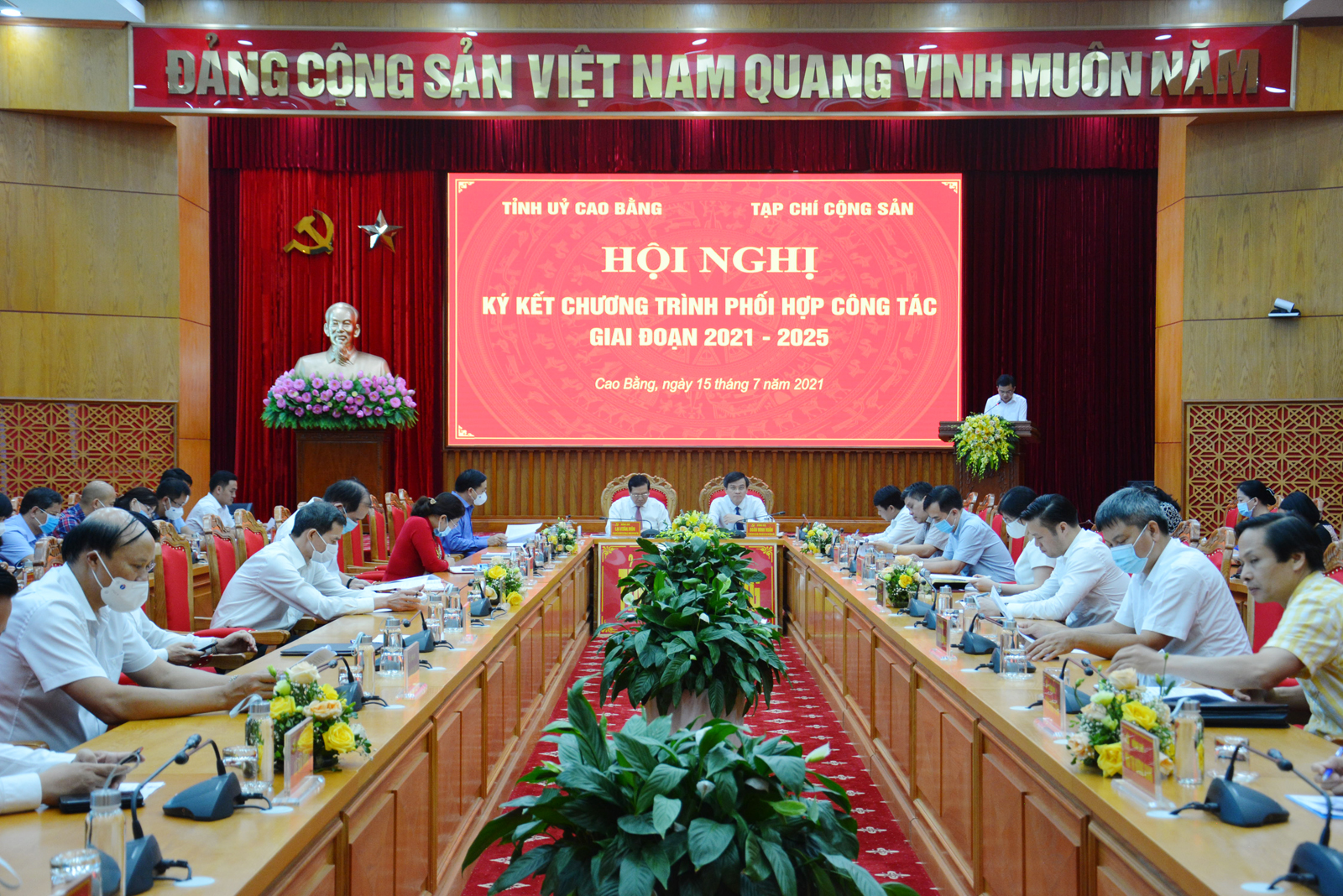 Để đáp ứng yêu cầu việc thực hiện nhiệm vụ chính trị trong tình hình mới, nhất là triển khai thực hiện thắng lợi Nghị quyết Đại hội XIII của Đảng, Nghị quyết Đại hội Đảng bộ tỉnh Cao Bằng lần thứ XIX, Tạp chí Cộng sản và Tỉnh ủy Cao Bằng ký kết Chương trình phối hợp công tác giai đoạn 2021 - 2025. Trên cơ sở phát huy thế mạnh của Tạp chí Cộng sản - cơ quan lý luận chính trị của Ban Chấp hành Trung ương Đảng - chương trình phối hợp công tác tập trung vào việc tổng kết thực tiễn, nghiên cứu lý luận - xuất phát từ thực tiễn của tỉnh Cao Bằng - nhất là nghiên cứu những cách làm mới, sáng tạo trong phát huy tiềm năng, thế mạnh, cơ hội nổi trội, cũng như việc nhận diện và xử lý các mâu thuẫn, thách thức, điểm nghẽn trong quá trình phát triển của tỉnh Cao Bằng; những bài học kinh nghiệm trong công tác xây dựng Đảng và hệ thống chính trị, bảo đảm quốc phòng - an ninh biên giới, việc triển khai thực hiện chương trình xây dựng nông thôn mới, công tác cải cách hành chính, thu hút đầu tư, hiệu quả của các công trình, dự án trọng điểm trên địa bàn, tiềm năng phát triển du lịch, bảo tồn và phát triển văn hóa, công tác an sinh xã hội…