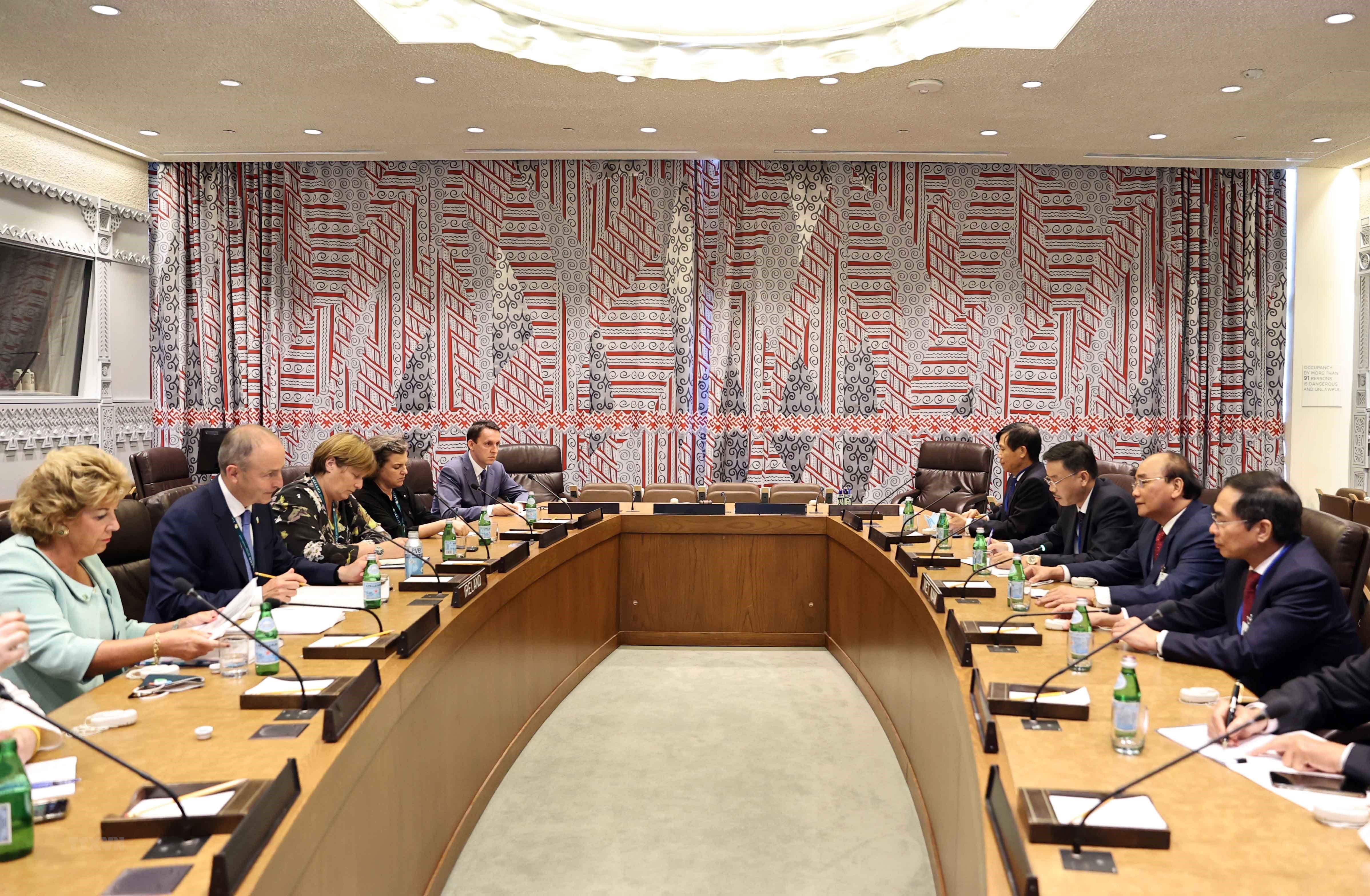 Tại cuộc gặp ngài Micheal Martin, Thủ tướng Ireland, nước Chủ tịch luân phiên của Hội đồng Bảo an Liên hợp quốc tháng 9-2021, hai nhà lãnh đạo bày tỏ vui mừng khi ngay cả trong bối cảnh dịch COVID-19, kim ngạch thương mại hai chiều giữa hai nước năm 2020 vẫn đạt 4,2 tỷ USD. Nhân dịp kỷ niệm 25 năm thiết lập quan hệ ngoại giao, Chủ tịch nước đề nghị sau khi kiểm soát tốt dịch bệnh, hai bên sớm nối lại việc trao đổi đoàn và tiếp xúc các cấp, thúc đẩy hợp tác trong các lĩnh vực khác. Chủ tịch nước Nguyễn Xuân Phúc mong Thủ tướng Ireland quan tâm, thúc đẩy Quốc hội Ireland sớm phê chuẩn Hiệp định Bảo hộ đầu tư Việt Nam - EU (EVIPA); tiếp tục duy trì ODA cho Việt Nam trong thời gian tới. Chủ tịch nước đề nghị Ireland hỗ trợ Việt Nam tiếp cận với nguồn cung vaccine, xem xét cung cấp các thiết bị y tế như máy thở, bộ kít xét nghiệm cho Việt Nam. Nhân dịp này, Chủ tịch nước Nguyễn Xuân Phúc đã cảm ơn sự phối hợp của Ireland tại Hội đồng Bảo an trong thời gian qua.