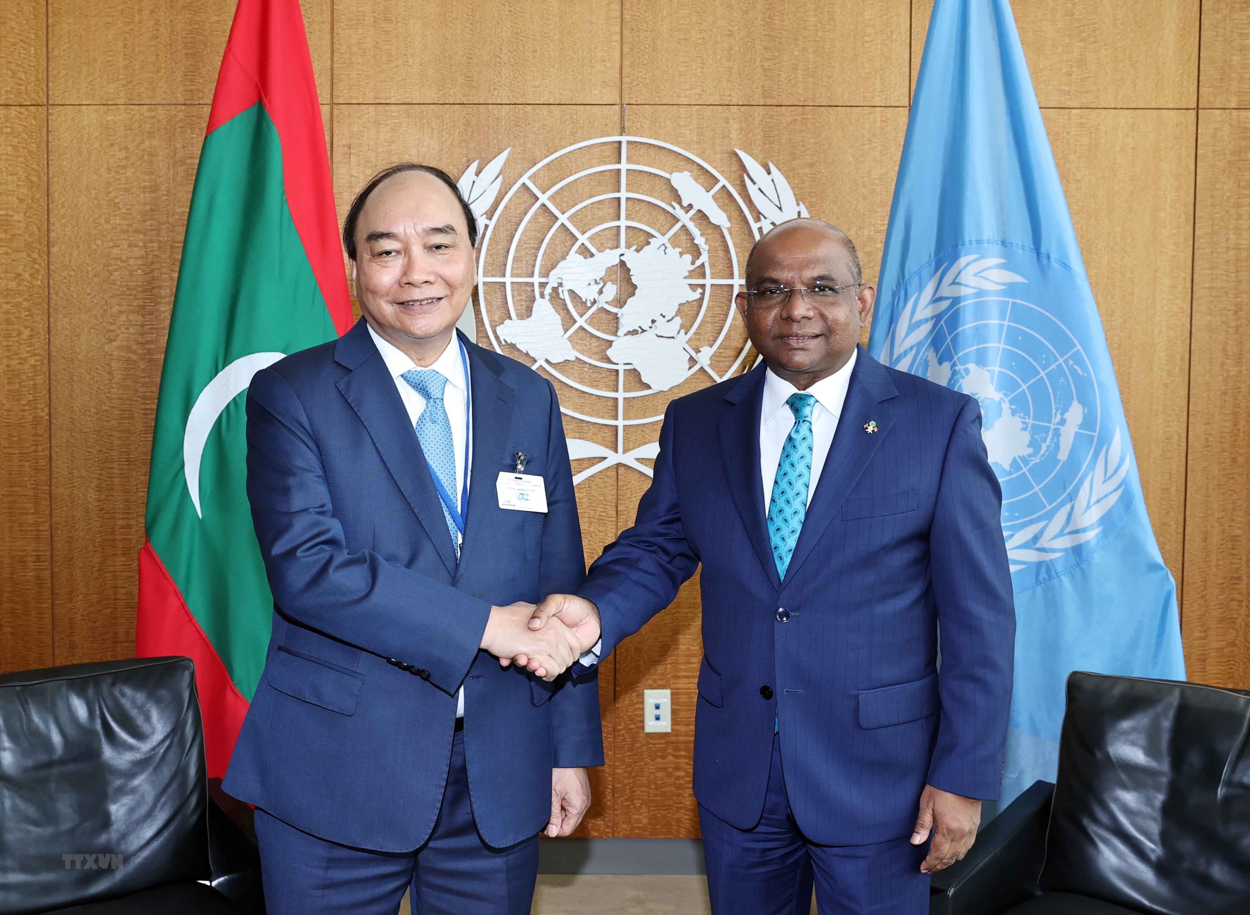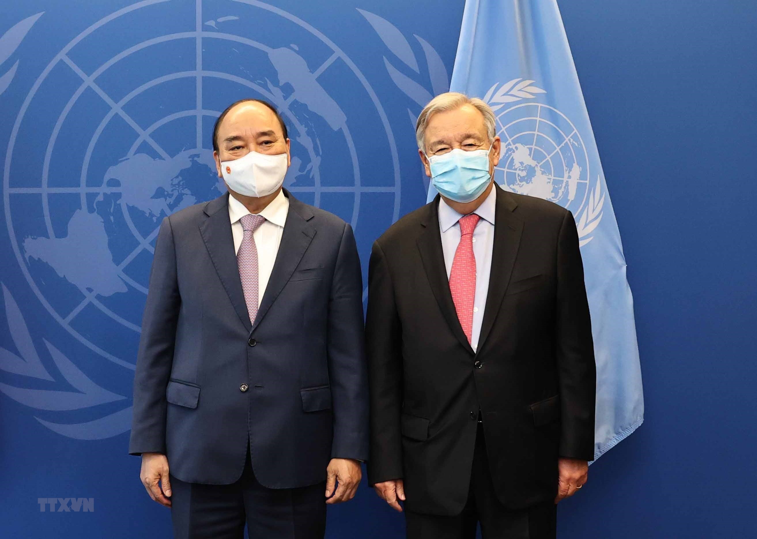 Tại hai cuộc hội kiến quan trọng với Chủ tịch Đại hội đồng Liên hợp quốc Abdulla Shahid và Tổng Thư ký Liên hợp quốc Antonio Guterres, Chủ tịch nước Nguyễn Xuân Phúc khẳng định Việt Nam coi trọng và ủng hộ vai trò trung tâm của Liên hợp quốc trong hệ thống quản trị toàn cầu nhằm ứng phó với các thách thức chung hết sức to lớn hiện nay và mong muốn thúc đẩy hợp tác toàn diện với Liên hợp quốc. Chủ tịch nước cho biết Việt Nam đang dồn mọi nỗ lực trong cuộc chiến chống COVID-19, đồng thời cảm ơn Chương trình COVAX và các tổ chức Liên hợp quốc đã hỗ trợ vaccine, trang thiết bị, vật tư y tế và tư vấn chính sách về phòng, chống dịch và phục hồi sau đại dịch và đề nghị Liên hợp quốc tiếp tục hỗ trợ Việt Nam trong thời gian tới, nhất là để hỗ trợ triển khai chiến dịch tiêm vaccine rộng rãi cho người dân.