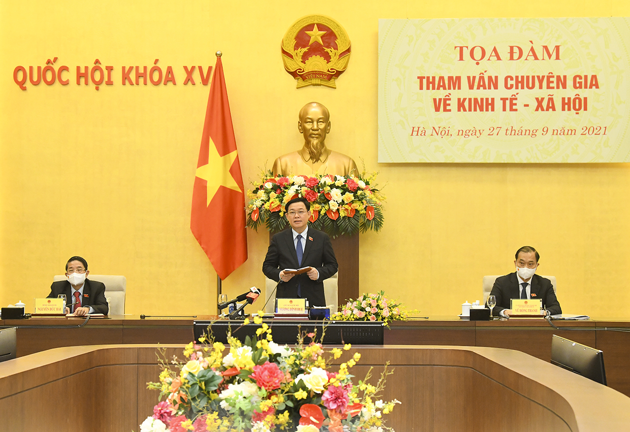 Chủ tịch Quốc hội Vương Đình Huệ cho biết, Ủy ban Thường vụ Quốc hội quyết định mở lại Diễn đàn kinh tế sau sự gián đoạn từ năm 2017. Tọa đàm là một trong những hoạt động đầu tiên trong khuôn khổ Diễn đàn kinh tế. Chủ tịch Quốc hội bày tỏ sự đồng tình và chia sẻ ý kiến đóng góp của chuyên gia với nhận định rằng việc phục hồi kinh tế trên thế giới vẫn chưa được bảo đảm, kể cả với những nước có tỷ lệ tiêm chủng vaccine phòng COVID-19 cao, trong khi vẫn còn có những nước chưa được an toàn. Từ đó, Chủ tịch Quốc hội nêu thông điệp là cần có sự chia sẻ bình đẳng về vaccine cho những nước nghèo hơn, những nước có tiềm lực kinh tế thấp hơn. Điều lưu ý nữa là những nước thuộc nhóm 2 (nước đang phát triển, trong đó có Việt Nam) có thể có suy giảm tăng trưởng trong trung và dài hạn. Các diễn giả dự báo về "rủi ro kép". Thứ nhất là chiến lược vaccine trên toàn cầu chậm hơn dự kiến, độ bao phủ không được đầy ở những nước này. Thứ hai là chính sách tài chính, tài khóa, tiền tệ toàn cầu có thể bị thắt chặt hơn nếu các nước tiên tiến thắt chặt chính sách tài khóa và tiền tệ nhanh hơn dự kiến để đối phó với rủi ro có thể gia tăng lạm phát do chính sách siêu nới lỏng.