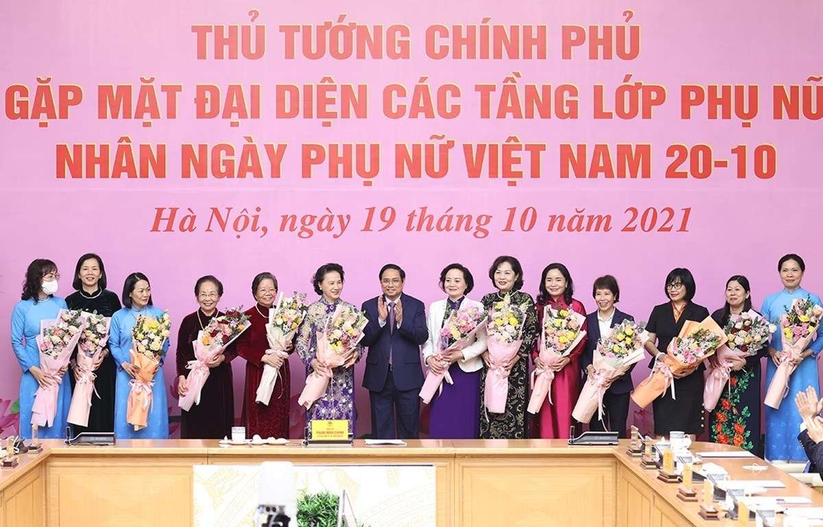 TCCS - Ngày 19-10-2021, Ủy viên Bộ Chính trị, Thủ tướng Chính phủ Phạm Minh Chính gặp mặt đại diện tiêu biểu các tầng lớp phụ nữ nhân kỷ niệm 91 năm ngày thành lập Hội Liên hiệp Phụ nữ Việt Nam, ngày Phụ nữ Việt Nam 20-10.