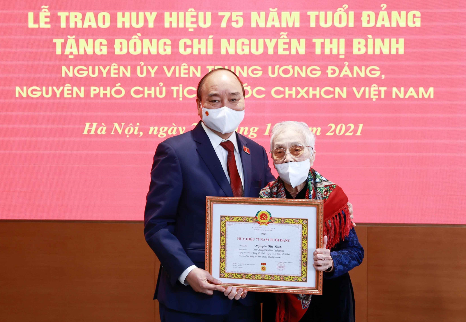 TCCS - Ngày 24-10-2021, tại Hà Nội, thay mặt lãnh đạo Đảng, Nhà nước, Ủy viên Bộ Chính trị, Chủ tịch nước Nguyễn Xuân Phúc trao Huy hiệu 75 năm tuổi Đảng tặng đồng chí Nguyễn Thị Bình, nguyên Ủy viên Trung ương Đảng, nguyên Phó Chủ tịch nước.