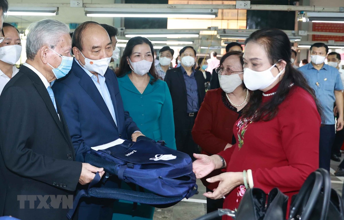 Ủy viên Bộ Chính trị, Chủ tịch nước Nguyễn Xuân Phúc thăm Công ty TNHH Sản xuất dịch vụ thương mại sản phẩm da LADODA (xã Tân Quang, huyện Văn Lâm, tỉnh Hưng Yên), do ông Đinh Quang Bào, 81 tuổi, là Chủ tịch Hội đồng quản trị _ Ảnh: TTXVN