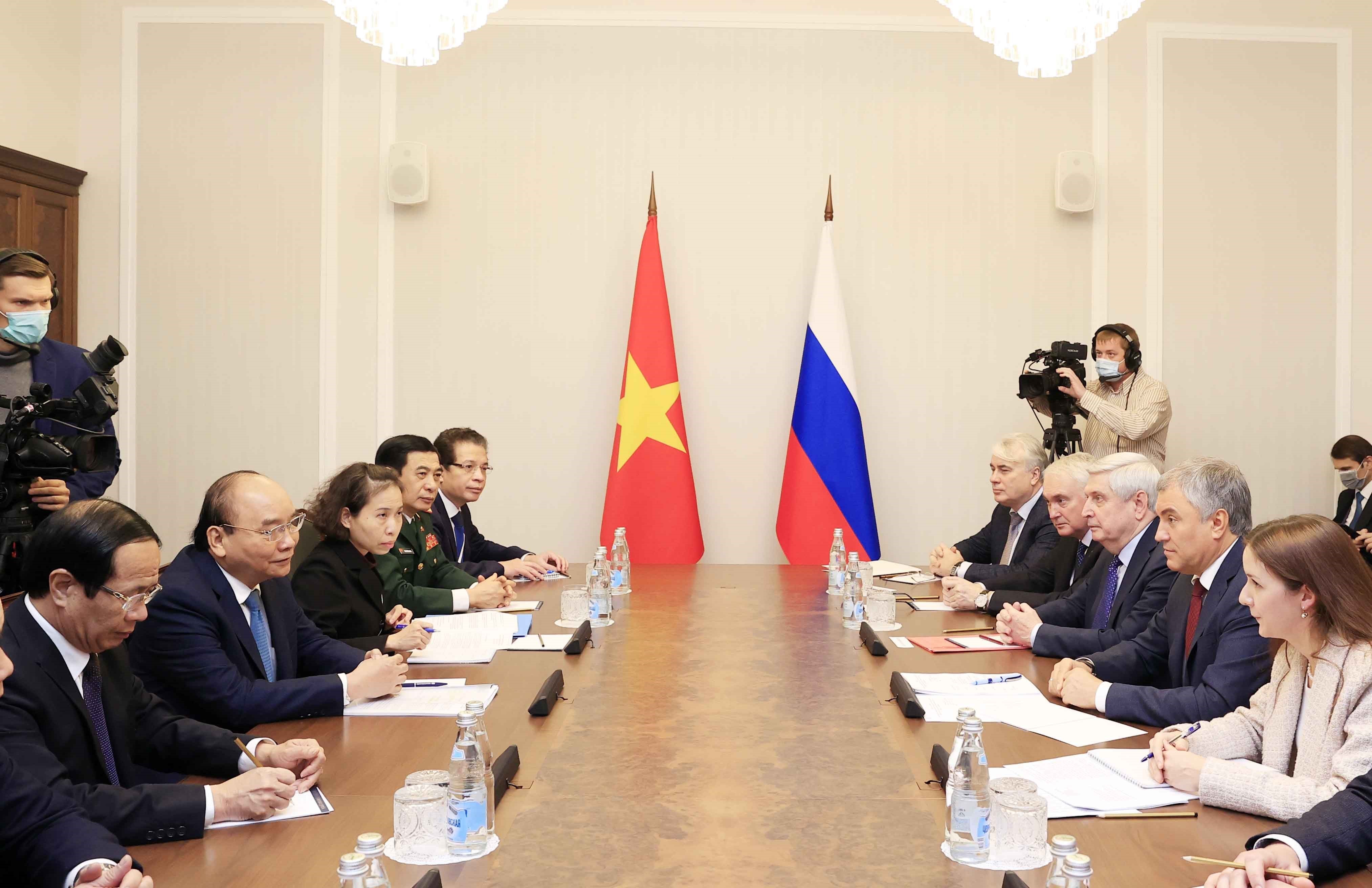 Tại buổi hội kiến với Chủ tịch Duma Quốc gia Nga Vyacheslav Volodin, Chủ tịch nước Nguyễn Xuân Phúc chúc mừng Liên bang Nga tổ chức thành công bầu cử Duma Quốc gia Nga vào tháng 9-2021 và cá nhân ông Volodin đã được tín nhiệm bầu lại làm Chủ tịch Duma Quốc gia Nga. Chủ tịch nước bày tỏ vui mừng về hợp tác chặt chẽ giữa Quốc hội Việt Nam với Duma Quốc gia Nga thời gian qua, trong đó có việc thành lập Ủy ban hợp tác liên nghị viện cấp cao giữa hai bên, mong hai Quốc hội phát huy hơn nữa vai trò của Ủy ban trong việc tăng cường hợp tác liên nghị viện nói riêng và quan hệ Đối tác chiến lược toàn diện Việt Nam - Nga nói chung.