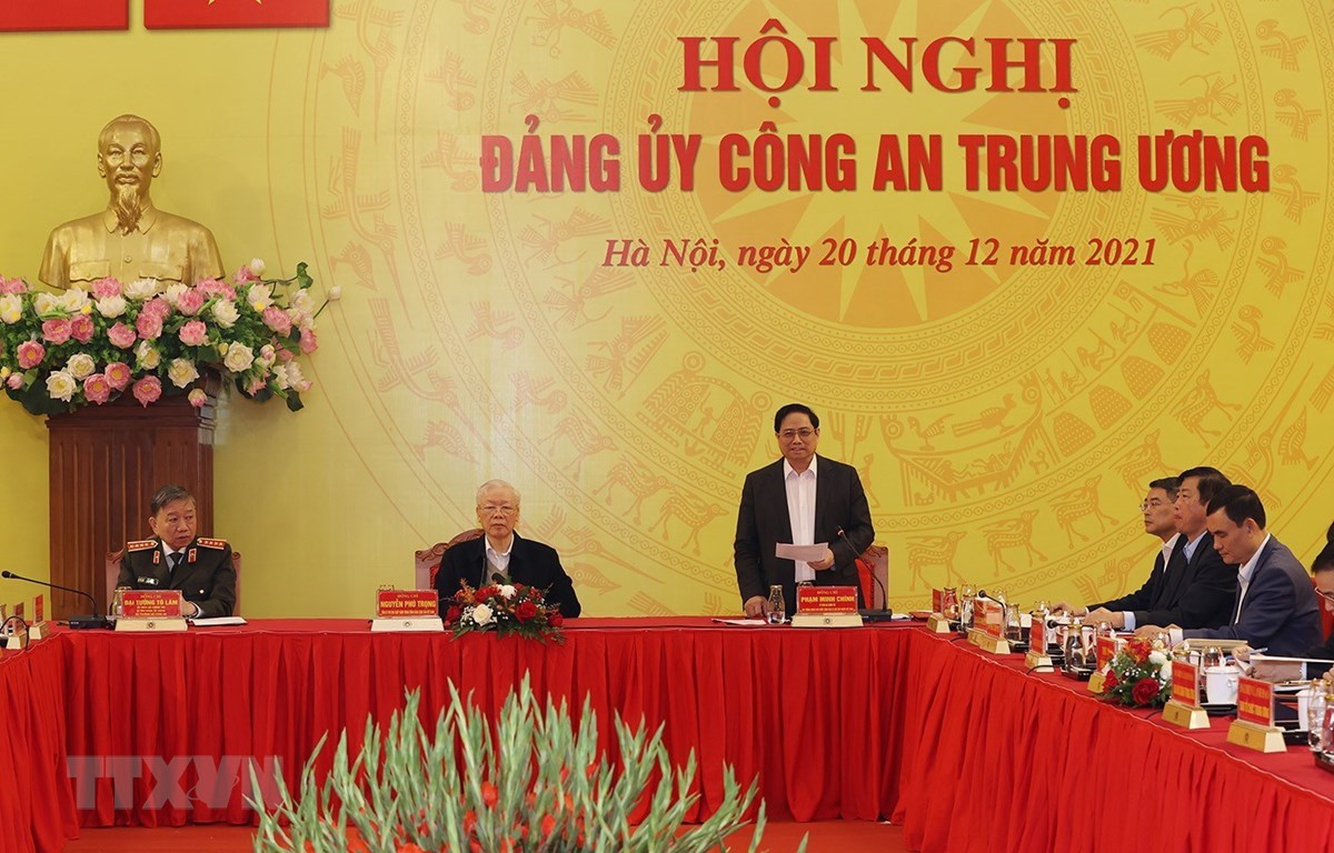 Phát biểu chỉ đạo hội nghị, Tổng Bí thư Nguyễn Phú Trọng và Thủ tướng Chính phủ Phạm Minh Chính ghi nhận, đánh giá cao những kết quả đạt được của Đảng ủy Công an Trung ương, Bộ Công an và công tác tổ chức hội nghị chu đáo, chặt chẽ, chất lượng, có tính chiến đấu cao. Tổng Bí thư Nguyễn Phú Trọng khẳng định, năm 2021, bối cảnh tình hình trong nước, thế giới, khu vực nhiều diễn biến mới, phức tạp. Đất nước diễn ra nhiều sự kiện chính trị, đối ngoại quan trọng; chịu tác động, ảnh hưởng của đại dịch COVID-19; có rất nhiều công việc đột xuất, cần tập trung giải quyết. Trong bối cảnh đó, chúng ta đã nỗ lực, cố gắng đạt được nhiều kết quả tốt đẹp trên tất cả các mặt kinh tế - xã hội, quốc phòng, an ninh, đối ngoại, giữ vững môi trường ổn định, an toàn, nhân dân phấn khởi.