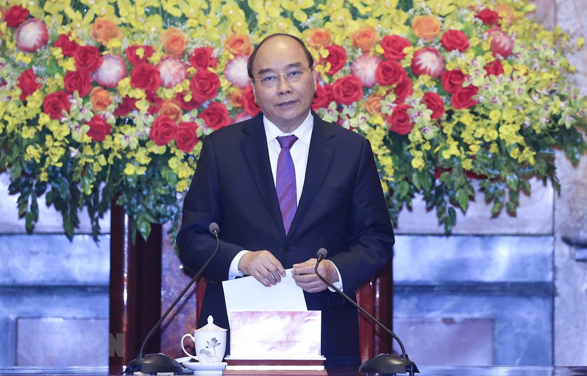 TCCS - Ngày 13-12-2021, tại Hà Nội, Ủy viên Bộ Chính trị, Chủ tịch nước Nguyễn Xuân Phúc tiếp 60 nữ sĩ quan, chiến sĩ, đại diện cho các đại biểu về dự Đại hội đại biểu Phụ nữ quân đội lần thứ VII (2021 - 2026) vừa kết thúc thành công tại Hà Nội.