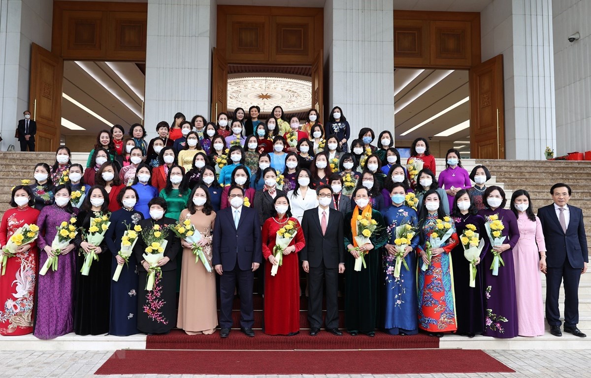 TCCS - Ngày 7-3-2022, tại Hà Nội, Ủy viên Bộ Chính trị, Thủ tướng Chính phủ Phạm Minh Chính gặp mặt đại diện nữ lãnh đạo, quản lý và nữ trí thức, văn nghệ sĩ tiêu biểu nhân Ngày Quốc tế Phụ nữ (8-3) và Kỷ niệm 1982 năm Khởi nghĩa Hai Bà Trưng.
