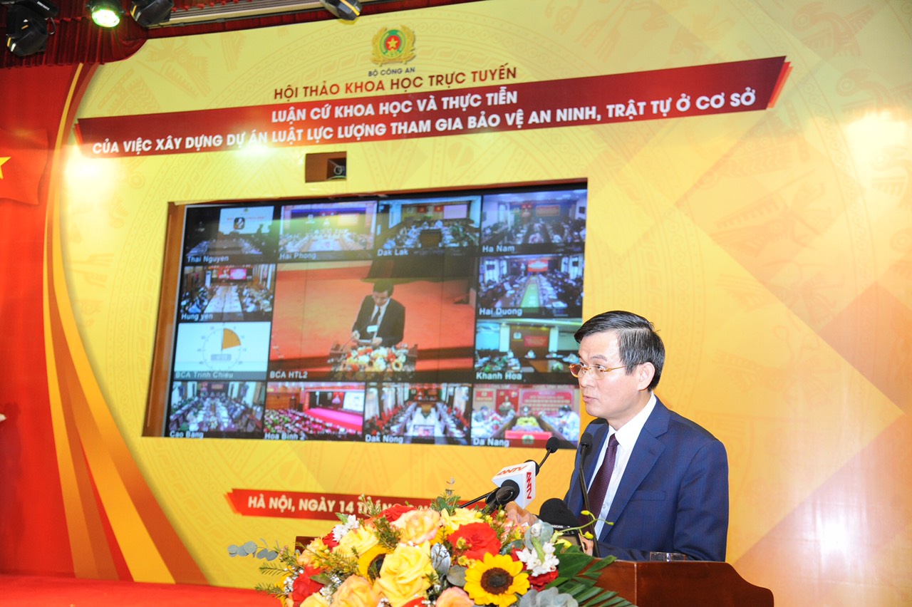 Phát biểu đề dẫn Hội thảo khoa học: “Luận cứ khoa học và thực tiễn của việc xây dựng dự án Luật Lực lượng tham gia bảo vệ an ninh, trật tự ở cơ sở”, Trung tướng, TS. Lê Quốc Hùng nhấn mạnh, dự án luật có vai trò, vị trí rất quan trọng, góp phần thể chế hóa quan điểm của Đảng về bảo vệ an ninh, trật tự, nhất là theo tinh thần Văn kiện Đại hội XIII; cụ thể hóa các Điều 46, 64, 68 Hiến pháp năm 2013, hướng tới xây dựng và hoàn thiện Nhà nước pháp quyền xã hội chủ nghĩa Việt Nam của nhân dân, do nhân dân, vì nhân dân trong tình hình mới, tạo cơ sở pháp lý để huy động lực lượng tham gia bảo vệ an ninh, trật tự ở cơ sở; góp phần bảo vệ an ninh, trật tự từ sớm, từ xa, từ cơ sở. Đồng chí cũng chỉ rõ, thực tiễn bảo vệ an ninh, trật tự cho thấy, những vấn đề phức tạp về an ninh, trật tự đều xuất phát từ địa bàn cơ sở… Vì vậy, việc nghiên cứu, đề xuất các giải pháp chính trị, pháp lý phù hợp, có tính chiến lược, ổn định, lâu dài để bảo vệ vững chắc an ninh, trật tự tại địa bàn đặc biệt quan trọng này là rất cần thiết.