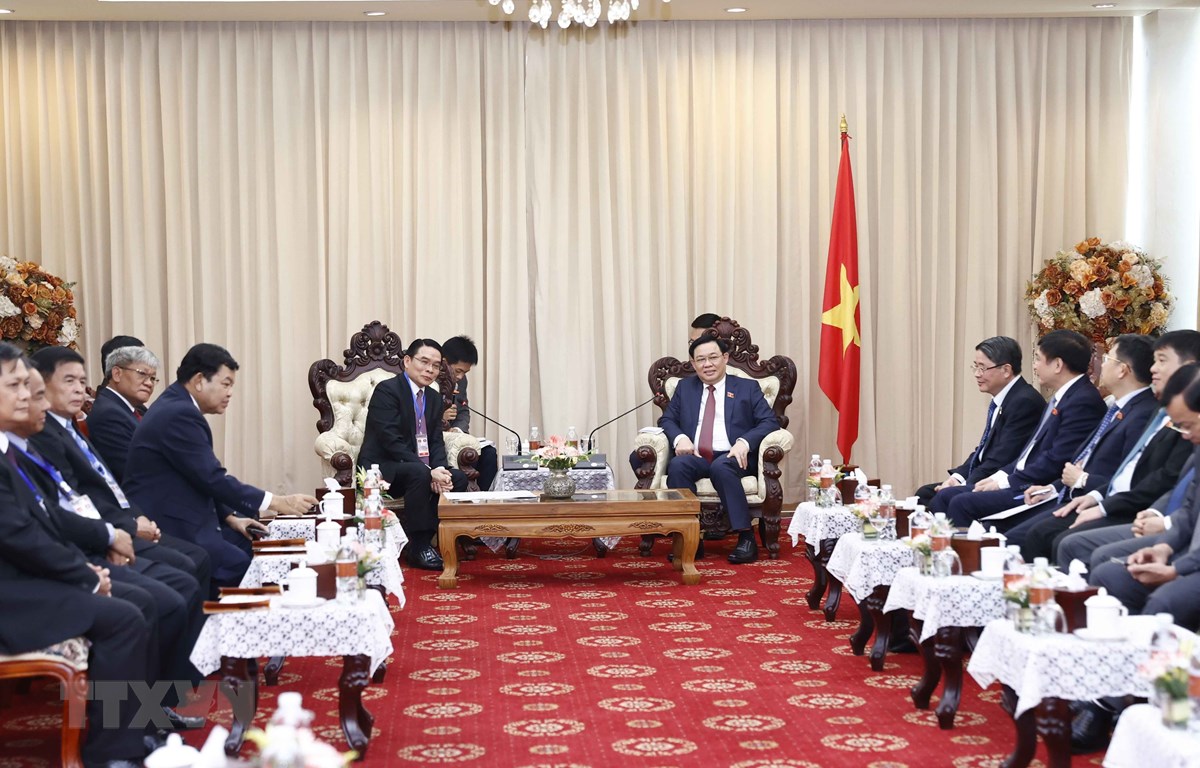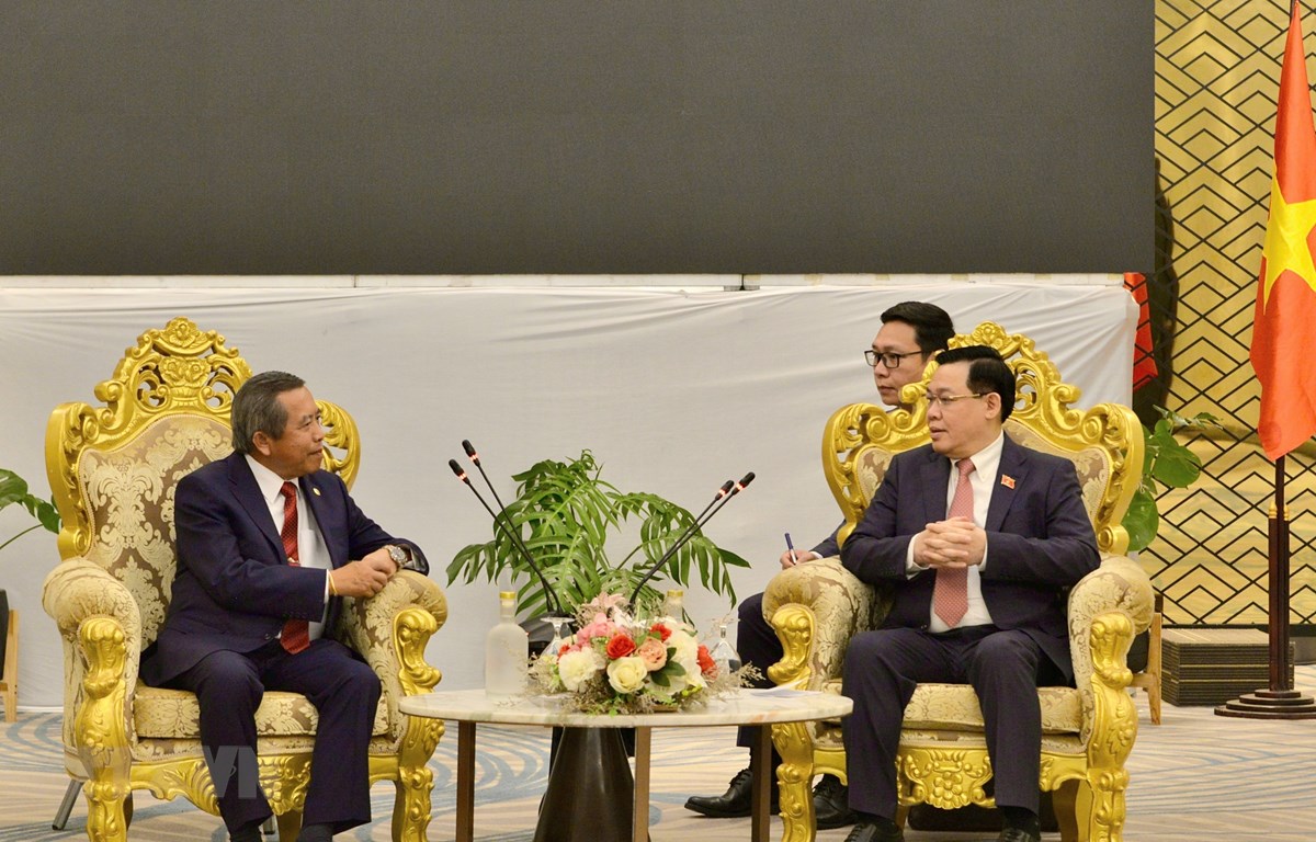 Trao đổi với Chủ tịch Nhóm Nghị sĩ hữu nghị Lào - Việt và Chủ tịch Hội Hữu nghị Lào - Việt Nam, Chủ tịch Quốc hội nhấn mạnh Việt Nam và Lào có mối quan hệ truyền thống tốt đẹp, sự gắn bó thủy chung, trong sáng, có một không hai trên thế giới. Hai nước không chỉ có mối quan hệ mật thiết giữa hai Đảng, hai Nhà nước mà quan hệ ngoại giao nhân dân Việt Nam - Lào cũng là một kênh đối ngoại rất quan trọng, trong đó có vai trò của các hội, hiệp hội. Chủ tịch Quốc hội trao đổi về nhiều vấn đề hai bên cùng quan tâm, trong đó có chương trình xây dựng luật trong kỳ họp sắp tới của hai Quốc hội, trong triển khai xây dựng các công trình trọng điểm quốc gia, kết cấu hạ tầng đường bộ… Quốc hội Lào cũng chuẩn bị xem xét về một số dự án luật, trong đó có luật đất đai, đầu tư, khoáng sản, chương trình mục tiêu quốc gia…; về sự phối hợp chặt chẽ, chia sẻ, đồng hành giữa Quốc hội với Chính phủ tại mỗi nước trong bảo đảm triển khai hiệu quả các nhiệm vụ được giao, nhất là trong việc triển khai các nhiệm vụ lập pháp, phát triển kinh tế - xã hội…
