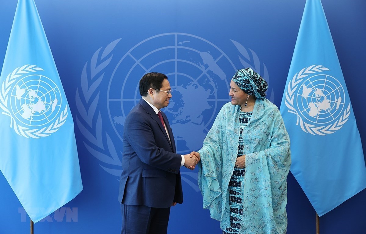 Tại cuộc gặp với các lãnh đạo của Liên hợp quốc và Hoa Kỳ, gồm: Phó Tổng Thư ký Liên hợp quốc, bà Amina Mohammed; Giám đốc điều hành Quỹ Nhi đồng Liên hợp quốc (UNICEF) Catherine Russell; Chủ tịch Đại Hội đồng Liên hợp quốc Abdulla Shahid; Tổng Giám đốc Chương trình Phát triển Liên hợp quốc (UNDP) Achim Steiner; Phó Thị trưởng thành phố thành phố Los Angeles bà Nina Hachigian, Thị trưởng thành phố San Francisco bà London Breed, Thủ tướng Chính phủ Phạm Minh Chính nhấn mạnh, năm 2022 có ý nghĩa đặc biệt, đánh dấu 45 năm Việt Nam gia nhập Liên hợp quốc - đối tác tin cậy hàng đầu vì hoà bình, hợp tác phát triển trên thế giới và người bạn tin cậy, gắn bó lâu dài của Việt Nam trong mọi chặng đường phát triển đất nước. Việt Nam cam kết sẽ tiếp tục phát huy vai trò, đóng góp tích cực và xây dựng hơn nữa vào công việc chung của Liên hợp quốc ở cả 3 trụ cột an ninh - chính trị, phát triển và quyền con người. Thủ tướng Chính phủ cho biết Việt Nam đang triển khai mạnh mẽ, toàn diện ba đột phá chiến lược để hiện thực hoá mục tiêu đưa đất nước trở thành nước công nghiệp, có thu nhập cao vào năm 2045; mong muốn tiếp tục đồng hành và hỗ trợ hiệu quả, trong đó có việc hỗ trợ triển khai Chương trình chuyển đổi số quốc gia đến năm 2025, định hướng đến năm 2030.