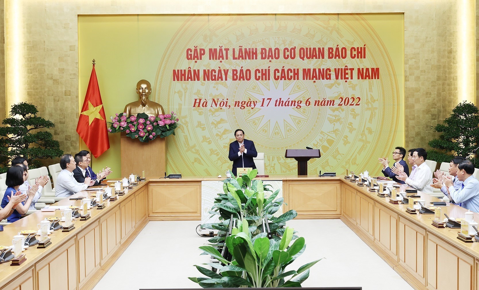 Phát biểu tại buổi gặp mặt, Thủ tướng Phạm Minh Chính đã nhắc lại lời căn dặn của Chủ tịch Hồ Chí Minh: “Báo chí cách mạng là một mặt trận chiến đấu của cách mạng; cán bộ báo chí cũng là chiến sĩ cách mạng; cây bút, trang giấy là vũ khí sắc bén của họ”. Trải qua 97 năm xây dựng và trưởng thành, dưới sự lãnh đạo của Đảng, sự dìu dắt của Bác Hồ, báo chí cách mạng Việt Nam không ngừng lớn mạnh về nhiều mặt. Thủ tướng Phạm Minh Chính cho rằng, đất nước ta đã trải qua năm 2021 và 6 tháng năm 2022 với nhiều điều rất đặc biệt. Trong khi toàn Đảng, toàn dân triển khai các nhiệm vụ sau Đại hội XIII của Đảng, bầu cử Đại biểu Quốc hội khóa XV, đại biểu hội đồng nhân dân các cấp nhiệm kỳ 2021 - 2026 và các nhiệm vụ thường xuyên khác, dịch COVID-19 lây lan mạnh, ảnh hưởng tới mọi mặt đời sống xã hội. Trên thế giới, cùng với việc phải đối phó với dịch COVID-19, cạnh tranh chiến lược tiếp tục diễn biến phức tạp; xảy ra xung đột tại Ukraine; giá dầu, giá nguyên liệu đầu vào, lạm phát gia tăng ở nhiều nước trên thế giới; tình trạng biến đổi khí hậu càng trở nên gay gắt...