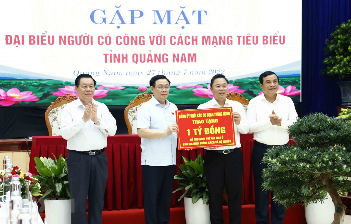 Tại cuộc gặp mặt, Chủ tịch Quốc hội Vương Đình Huệ trao bảng tượng trưng 1 tỷ đồng do Đảng ủy Khối các cơ quan Trung ương hỗ trợ xây dựng nhà ở cho người có công trên địa bàn tỉnh Quảng Nam. Chủ tịch Quốc hội Vương Đình Huệ, Trưởng Ban Tuyên giáo Trung ương Nguyễn Trọng Nghĩa và các đồng chí lãnh đạo trao 75 phần quà tặng 75 đại biểu người có công với cách mạng tiêu biểu của tỉnh Quảng Nam.
