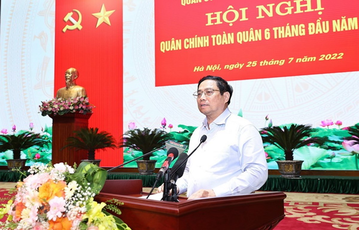 TCCS - Ngày 25-7-2022, tại Hà Nội, Ủy viên Bộ Chính trị, Thủ tướng Chính phủ Phạm Minh Chính dự và phát biểu chỉ đạo tại Hội nghị Quân chính toàn quân để đánh giá công tác lãnh đạo, chỉ đạo nhiệm vụ quân sự, quốc phòng 6 tháng đầu năm và nhiệm vụ 6 tháng năm 2022, do Quân ủy Trung ương, Bộ Quốc phòng tổ chức.