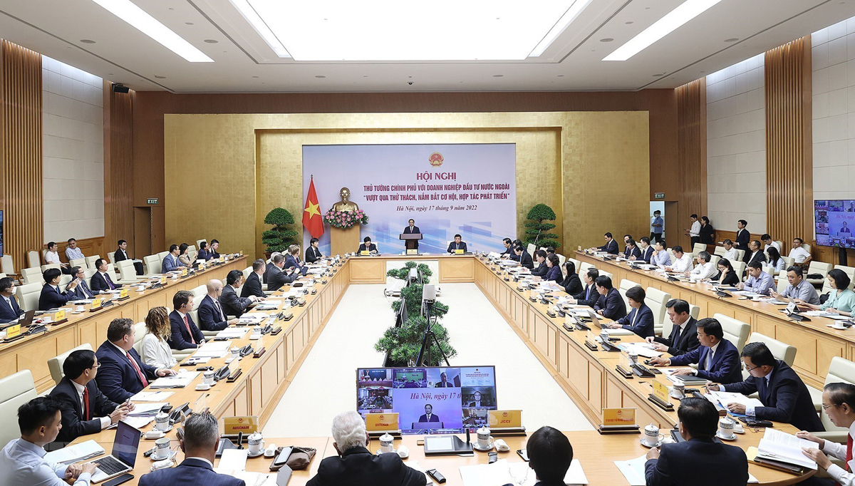 TCCS - Ngày 17-9-2022, Ủy viên Bộ Chính trị, Thủ tướng Chính phủ Phạm Minh Chính chủ trì Hội nghị của Thủ tướng Chính phủ với doanh nghiệp, hiệp hội doanh nghiệp đầu tư nước ngoài, với chủ đề “vượt qua thử thách, nắm bắt cơ hội, hợp tác phát triển”.