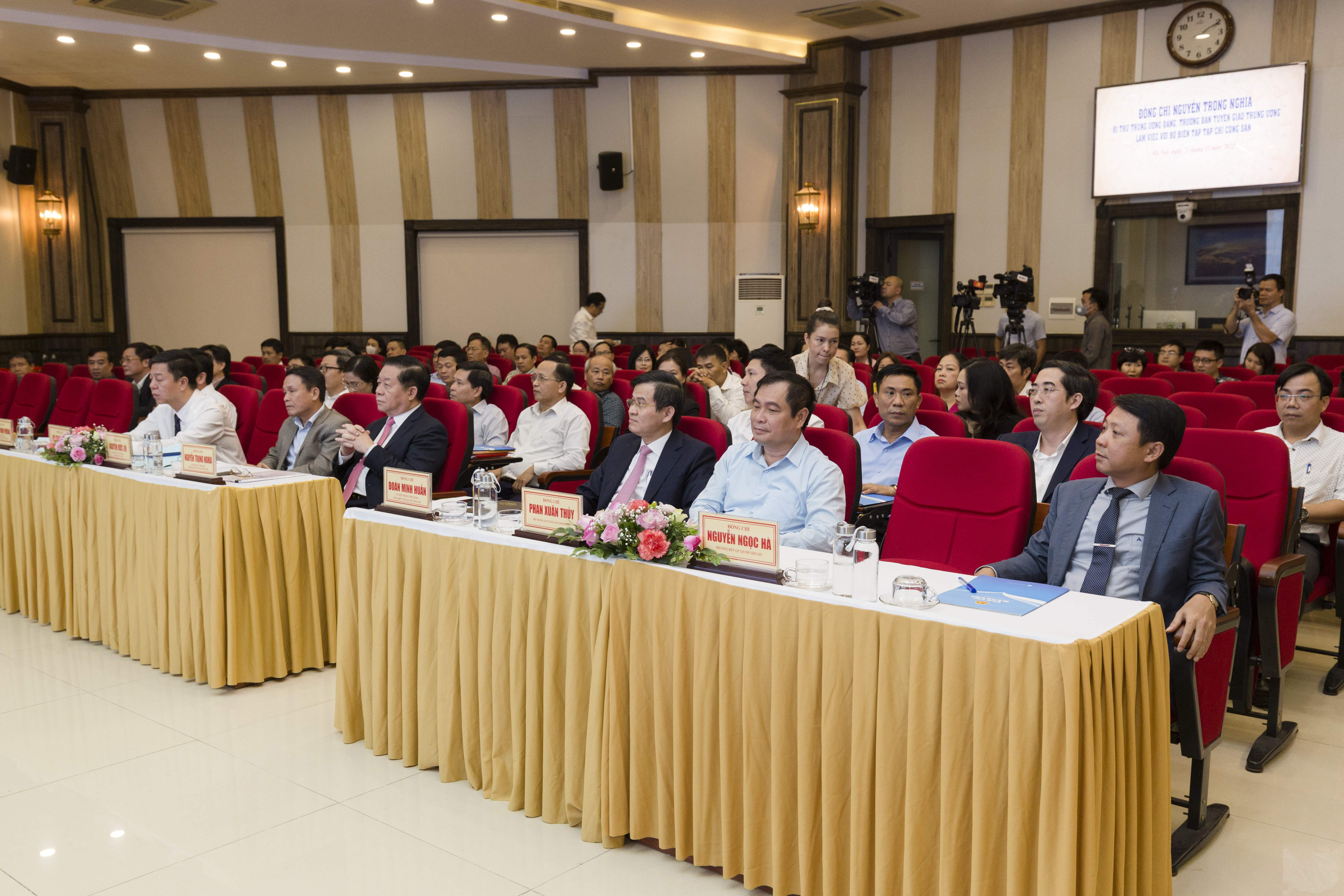 Đón tiếp Đoàn công tác của Ban Tuyên giáo Trung ương, về phía lãnh đạo Bộ Biên tập Tạp chí Cộng sản có Ủy viên Trung ương Đảng, Tổng Biên tập Tạp chí Cộng sản, PGS, TS. Đoàn Minh Huấn; Phó Tổng Biên tập Tạp chí Cộng sản, PGS, TS. Nguyễn Ngọc Hà; Phó Tổng Biên tập Tạp chí Cộng sản, PGS, TS. Vũ Trọng Lâm; cùng các đồng chí Ủy viên Ban Biên tập, trưởng, phó các đơn vị, toàn thể biên tập viên, nhân viên của Tạp chí Cộng sản. Cùng dự còn có các đồng chí lãnh đạo, đại diện các đơn vị của Ban Tuyên giáo Trung ương, Ban Đối ngoại Trung ương, Tập Đoàn Công nghiệp - Viễn thông Quân đội (Viettel), Công ty Phát hành báo chí Trung ương...