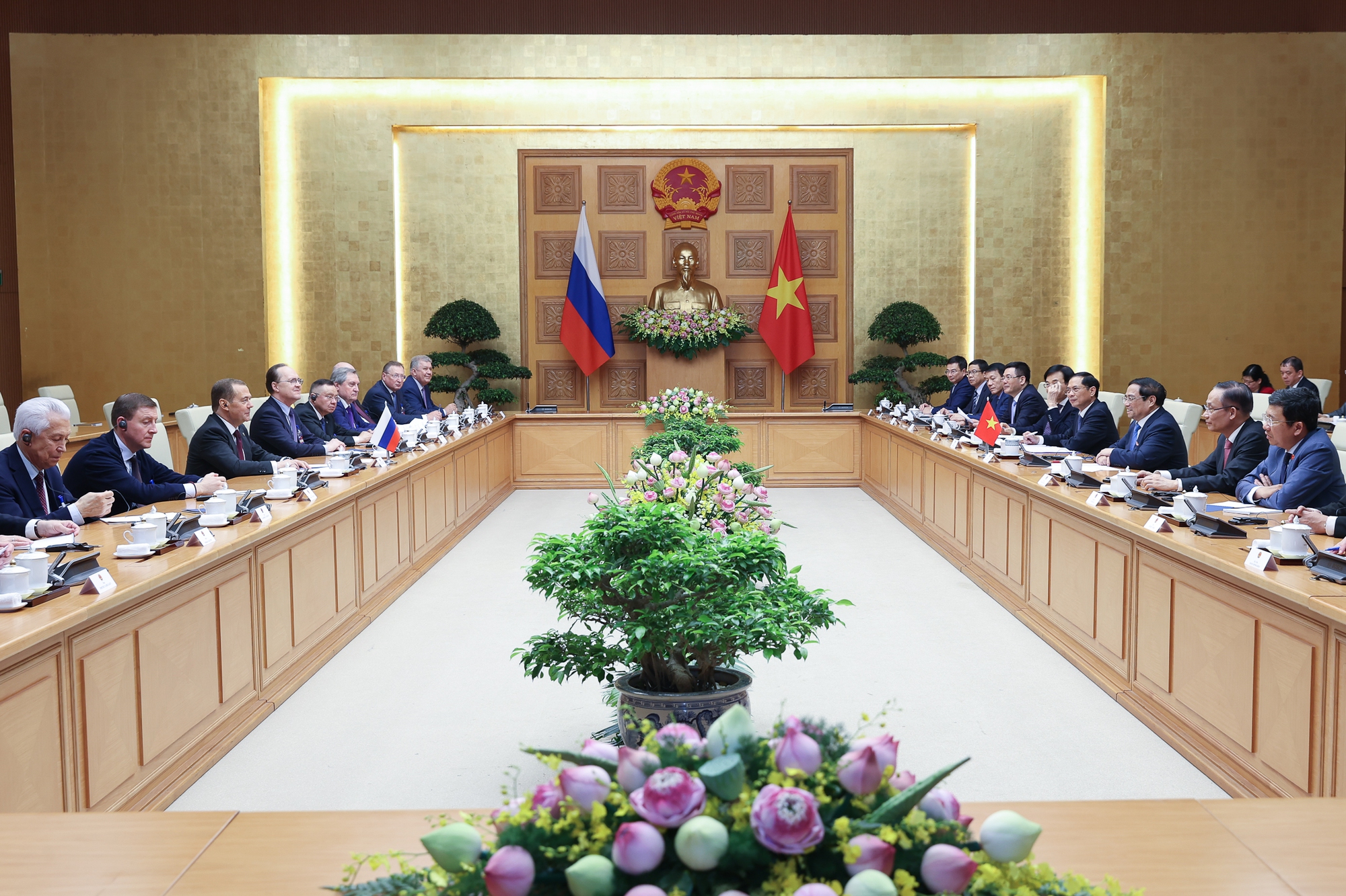 Tại các buổi hội kiến, các nhà lãnh đạo hai nước hoan nghênh những kết quả chính trong hợp tác thời gian qua, nhất là lĩnh vực kinh tế - thương mại, khoa học, giáo dục - đào tạo, hợp tác địa phương… Chủ tịch nước Võ Văn Thưởng và Thủ tướng Chính phủ Phạm Minh Chính khẳng định, Việt Nam nhất quán thực hiện đường lối đối ngoại độc lập, tự chủ, đa phương hóa, đa dạng hóa; luôn ghi nhớ sự ủng hộ và giúp đỡ mà nhân dân Liên Xô trước đây dành cho Việt Nam trong công cuộc xây dựng và bảo vệ Tổ quốc; coi trọng quan hệ Đối tác chiến lược toàn diện Việt Nam - Nga, mong muốn cùng Nga tiếp tục phát triển mối quan hệ hữu nghị truyền thống và đối tác chiến lược toàn diện vì lợi ích phát triển của hai quốc gia, vì sự thịnh vượng của hai dân tộc.