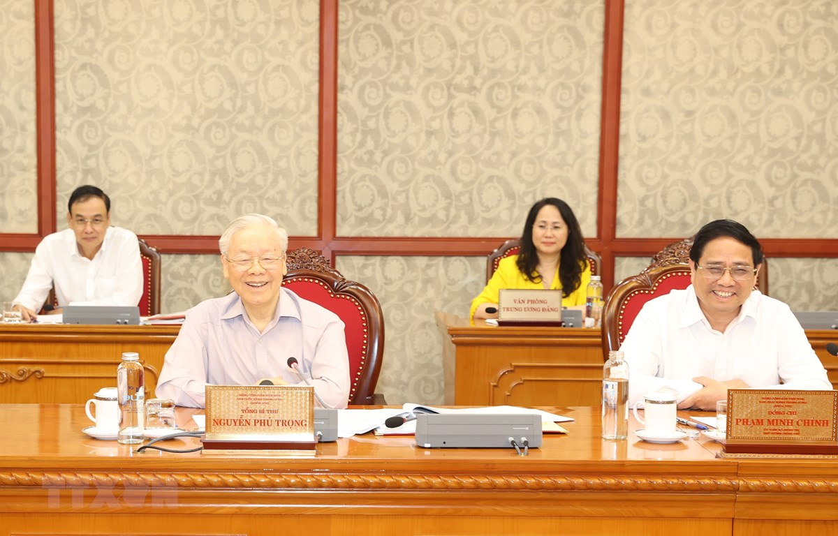 TCCS - Ngày 16-6-2023, tại trụ sở Trung ương Đảng, Tổng Bí thư Nguyễn Phú Trọng đã chủ trì cuộc họp Bộ Chính trị, Ban Bí thư cho ý kiến về Đề án tổng kết 20 năm thực hiện Nghị quyết số 23-NQ/TW, ngày 12-3-2003, của Ban Chấp hành Trung ương Đảng khóa IX, “Về phát huy sức mạnh đại đoàn kết toàn dân tộc vì dân giàu, nước mạnh, xã hội công bằng, dân chủ, văn minh”.