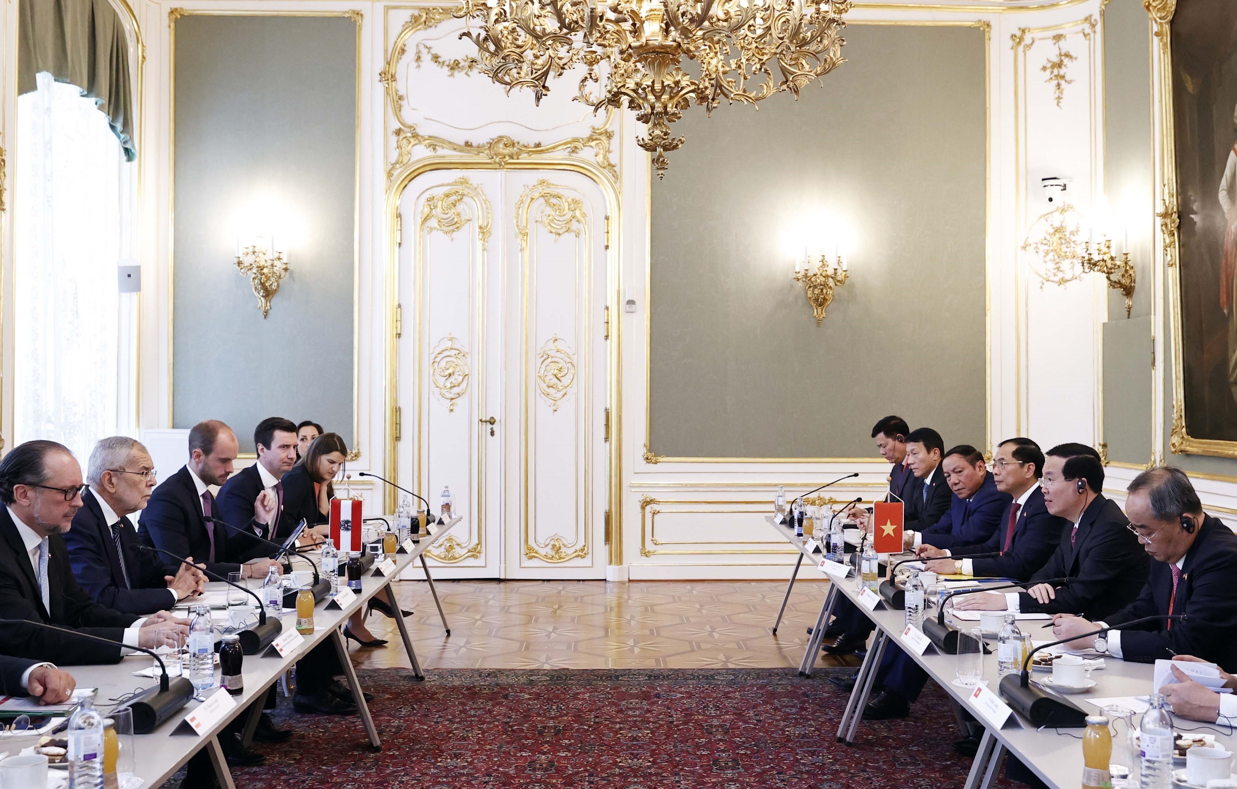 Ủy viên Bộ Chính trị, Chủ tịch nước Võ Văn Thưởng và Đoàn đại biểu cấp cao Việt Nam hội đàm với Tổng thống Alexander Van der Bellen và Đoàn đại biểu cấp cao Cộng hòa Áo_Ảnh: TTXVN