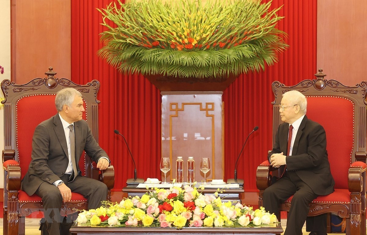Chủ tịchVyacheslav Vichtorovich Volodin bày tỏ vui mừng được thăm lại Việt Nam và gặp lại Tổng Bí thư Nguyễn Phú Trọng, đồng thời trân trọng chuyển lời chào thân thiết của Tổng thống Nga Vladimir Putin và các lãnh đạo cấp cao của Liên bang Nga tới Tổng Bí thư Nguyễn Phú Trọng. Chủ tịch Vyacheslav Vichtorovich Volodin khẳng định, dù có nhiều đảng theo các khuynh hướng chính trị khác nhau nhưng Duma Quốc gia Quốc hội Liên bang Nga luôn ủng hộ thúc đẩy quan hệ đối tác chiến lược toàn diện với Việt Nam. Liên bang Nga luôn coi Việt Nam là đối tác ưu tiên, quan trọng trong chính sách đối ngoại của mình tại khu vực châu Á - Thái Bình Dương.