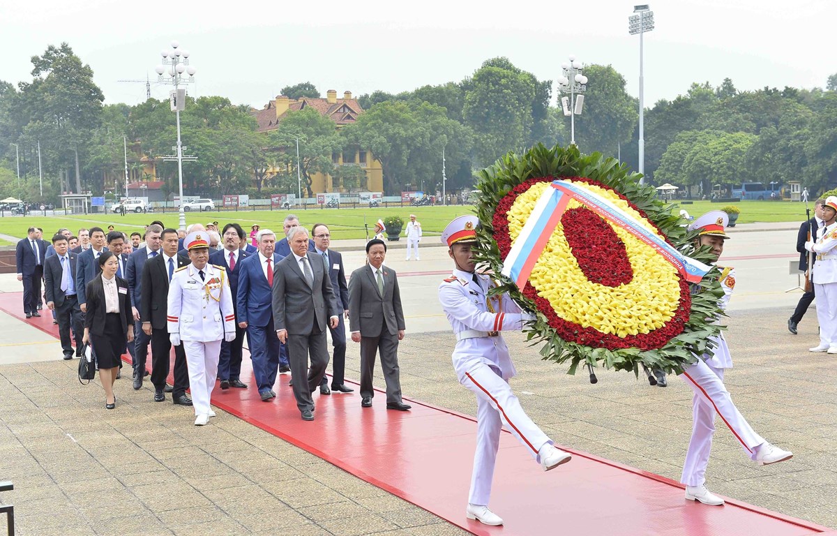Trong khuôn khổ chuyến thăm chính thức Việt Nam, Chủ tịch Duma Quốc gia Quốc hội Liên bang Nga Vyacheslav Vichtorovich Volodin dẫn đầu Đoàn đại biểu cấp cao Liên bang Nga đã đến đặt vòng hoa và vào Lăng viếng Chủ tịch Hồ Chí Minh; đặt vòng hoa tưởng niệm các anh hùng liệt sĩ tại Đài tưởng niệm các anh hùng liệt sĩ trên đường Bắc Sơn./.