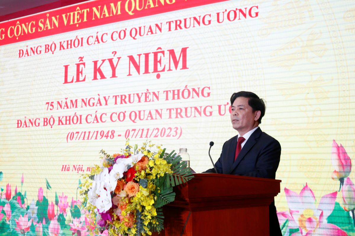 Tại lễ kỷ niệm, diễn văn ôn lại những mốc son lịch sử, Bí thư Đảng ủy Khối các cơ quan Trung ương Nguyễn Văn Thể nêu rõ, sau khi Cách mạng Tháng Tám thành công năm 1945, tại Chiến khu Việt Bắc, các cơ quan trung ương ở phân tán, xa nhau nên việc sinh hoạt của chi bộ không thuận lợi; do đó, Hội nghị toàn thể chi bộ các cơ quan Trung ương diễn ra ngày 1-11-1948 đã đề nghị thành lập Liên chi cơ quan Trung ương để tiện cho việc sinh hoạt đảng. Ngày 7-11-1948, Liên chi Cơ quan Trung ương (tiền thân của Đảng bộ Khối các cơ quan Trung ương) được thành lập tại Chiến khu Việt Bắc. Ngày đầu thành lập, Liên chi Cơ quan Trung ương có 6 chi bộ và được tổ chức theo các nhóm cơ quan ở Trung ương. Sau 75 năm xây dựng và phát triển, đến nay, Đảng bộ Khối các cơ quan Trung ương có 61 đảng bộ, chi bộ trực thuộc với gần 8 vạn đảng viên sinh hoạt tại 5.623 chi bộ. Qua các thời kỳ của cách mạng, để bảo đảm thực hiện nhiệm vụ và đáp ứng yêu cầu của thực tiễn, Đảng bộ Khối đã trải qua 5 lần tách, nhập, hợp nhất, sắp xếp, tổ chức lại có quy mô lớn và số lượng đảng viên đông, phân bố rộng khắp ở cả trong và ngoài nước như hiện nay.