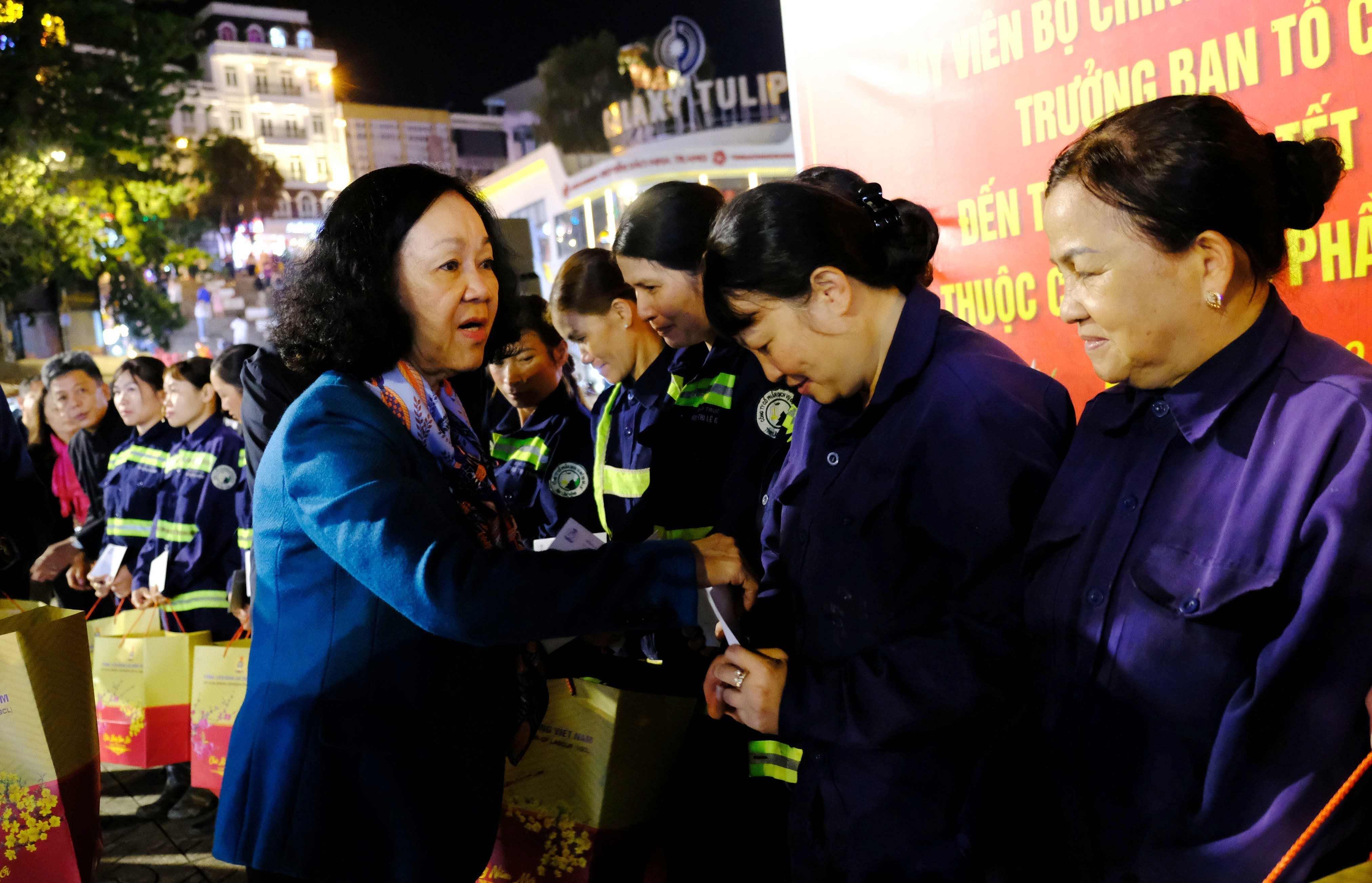 TCCS - Ngày 9-2-2024 (đêm Giao thừa tết Nguyên đán Giáp Thìn 2024), Ủy viên Bộ Chính trị, Thường trực Ban Bí thư, Trưởng Ban Tổ chức Trung ương Trương Thị Mai cùng lãnh đạo tỉnh Lâm Đồng đã đến thăm, chúc tết các nữ lao công tại chợ đêm Đà Lạt, thành phố Đà Lạt.