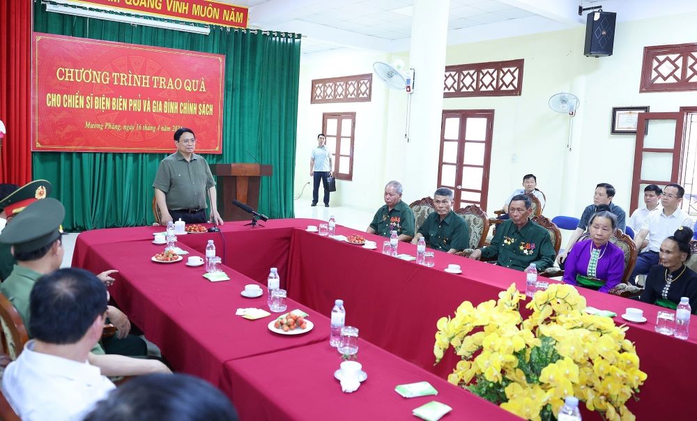 TCCS - Hướng tới kỷ niệm 70 năm Chiến thắng lịch sử Điện Biên Phủ (7-5-1954 – 7-5-2024), ngày 16-4-2024, Ủy viên Bộ Chính trị, Thủ tướng Chính phủ Phạm Minh Chính dâng hương tại Khu tưởng niệm Đại tướng Võ Nguyên Giáp ở Khu di tích Sở Chỉ huy chiến dịch Điện Biên Phủ; gặp mặt, tặng quà tri ân gia đình các chiến sĩ Điện Biên, gia đình chính sách tại xã Mường Phăng, thành phố Điện Biên Phủ, tỉnh Điện Biên.