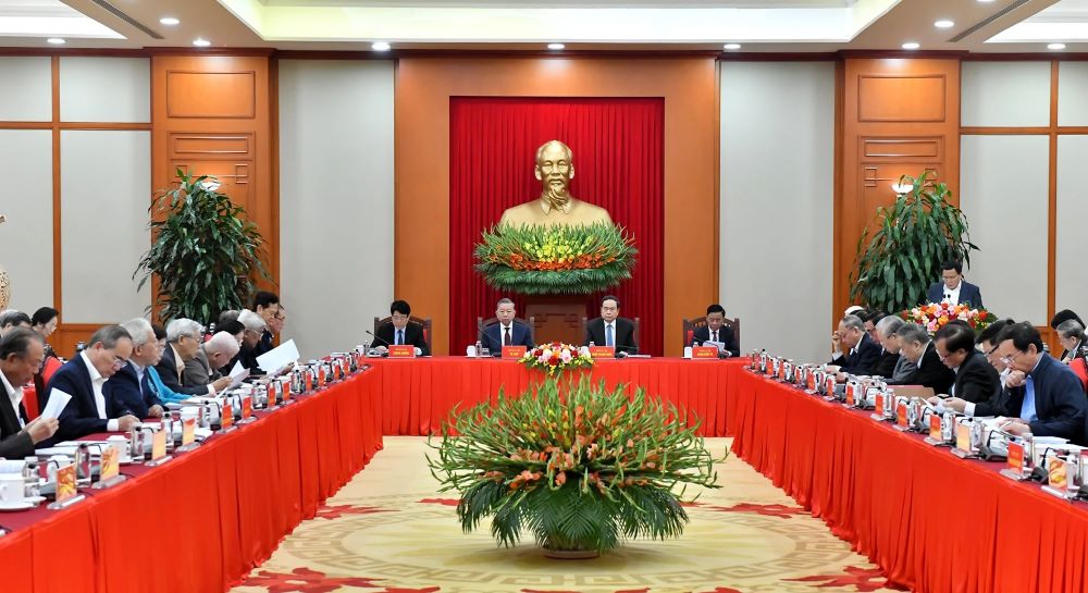 Phát biểu tại hội nghị, Tổng Bí thư Tô Lâm nhấn mạnh, hiện nay, cơ đồ, tiềm lực, vị thế và uy tín của đất nước đã được tạo dựng qua các giai đoạn lịch sử, nhất là qua 40 năm đổi mới và có sự đóng góp rất to lớn của các thế hệ lãnh đạo. Do vậy, cần nhận thức rõ trách nhiệm phải phát huy những thành tựu có ý nghĩa lịch sử đưa đất nước vào giai đoạn phát triển mới. Các văn kiện trình Đại hội Đảng lần thứ XIV phải là sản phẩm, công trình kết tinh trí tuệ của tập thể toàn Đảng, toàn dân, toàn quân. Do đó, phải phát huy dân chủ, trí tuệ tập thể, phải có sự tham gia đóng góp của các ban, bộ, ngành trung ương, các địa phương, các tổ chức chính trị - xã hội và nhân dân, đặc biệt là sự tham gia đóng góp của các đồng chí nguyên lãnh đạo Đảng, Nhà nước - là những người có trí tuệ uyên thâm, sâu sắc về lý luận, am tường về thực tiễn và có nhiều năm đã tham gia lãnh đạo, chỉ đạo các mặt công tác của Đảng và Nhà nước.