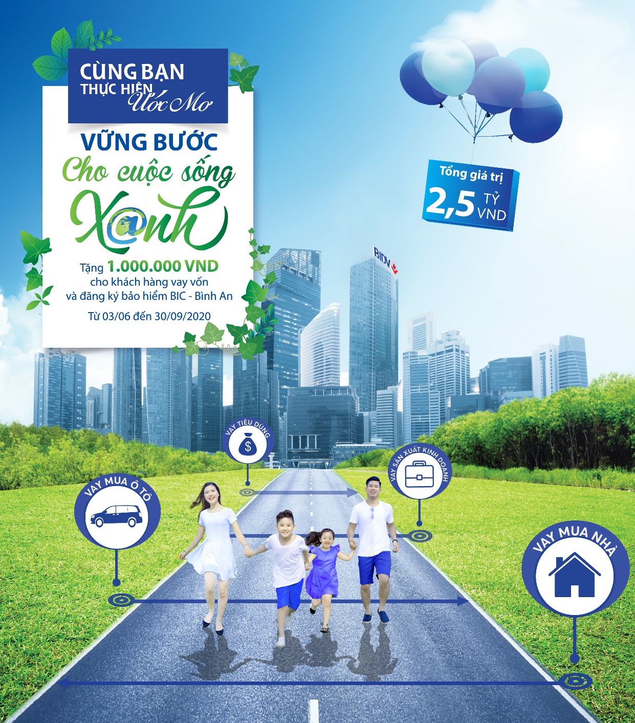 TCCS - Từ 3-6 đến 30-9-2020 (hoặc đến khi hết quà tặng), 2.500 khách hàng vay vốn đầu tiên tại BIDV và đăng ký sản phẩm bảo hiểm cho người vay vốn BIC Bình An sẽ được nhận ngay quà tặng trị giá 1.000.000 đồng/khách hàng bằng tiền mặt hoặc chuyển khoản.