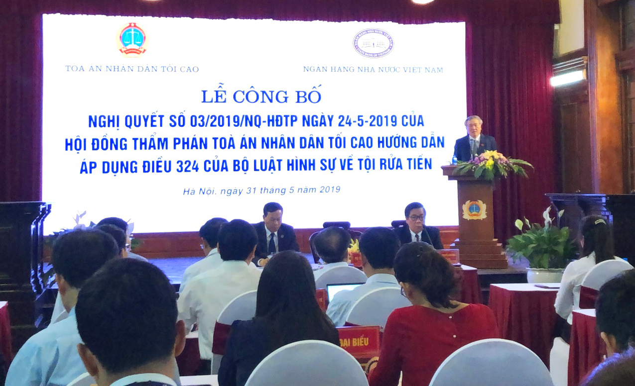 Ngày 24-5-2019, Hội đồng Thẩm phán Tòa án nhân dân tối cao đã ban hành Nghị quyết số 03/2019/NQ-HĐTP, hướng dẫn áp dụng Điều 324 của Bộ luật Hình sự về tội rửa tiền. Nghị quyết quy định nhiều tội phạm là tội phạm nguồn của tội rửa tiền như: Tội giết người; tội cố ý gây thương tích hoặc gây tổn hại cho sức khỏe của người khác; tội mua bán người; tội mua bán người dưới 16 tuổi; tội cướp tài sản; tội bắt cóc nhằm chiếm đoạt tài sản; tội trộm cắp tài sản; tội lừa đảo chiếm đoạt tài sản; tội lạm dụng tín nhiệm chiếm đoạt tài sản; tội buôn lậu; tội vận chuyển trái phép hàng hóa, tiền tệ qua biên giới; tội sản xuất, buôn bán hàng cấm; tội tàng trữ, vận chuyển hàng cấm; tội sản xuất, buôn bán hàng giả; tội trốn thuế; tội làm, tàng trữ, vận chuyển, lưu hành tiền giả; tội thao túng thị trường chứng khoán; tội xâm phạm quyền tác giả, quyền liên quan; tội vi phạm quy định về bảo vệ động vật hoang dã; tội gây ô nhiễm môi trường; tội vi phạm quy định về bảo vệ động vật nguy cấp, quý, hiếm; tội tàng trữ trái phép chất ma túy; tội vận chuyển trái phép chất ma túy; tội mua bán trái phép chất ma túy; tội chiếm đoạt chất ma túy; tội khủng bố; tội tài trợ khủng bố; tội bắt cóc con tin; tội chế tạo, tàng trữ, vận chuyển, sử dụng, mua bán trái phép hoặc chiếm đoạt vũ khí quân dụng, phương tiện kỹ thuật quân sự; tội đánh bạc; tội tổ chức đánh bạc hoặc gá bạc; tội tham ô tài sản; tội nhận hối lộ; tội lạm dụng chức vụ, quyền hạn chiếm đoạt tài sản… Nghị quyết cũng quy định về một số dạng thức của hành vi rửa tiền liên quan đến việc định tội.